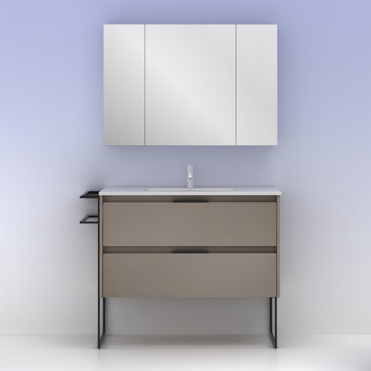 Meuble de salle de bain en bois de coloris marron fumé, sur pieds en métal noir.