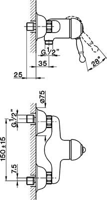 Robinet mitigeur douche mural de style traditionnel et rétro.