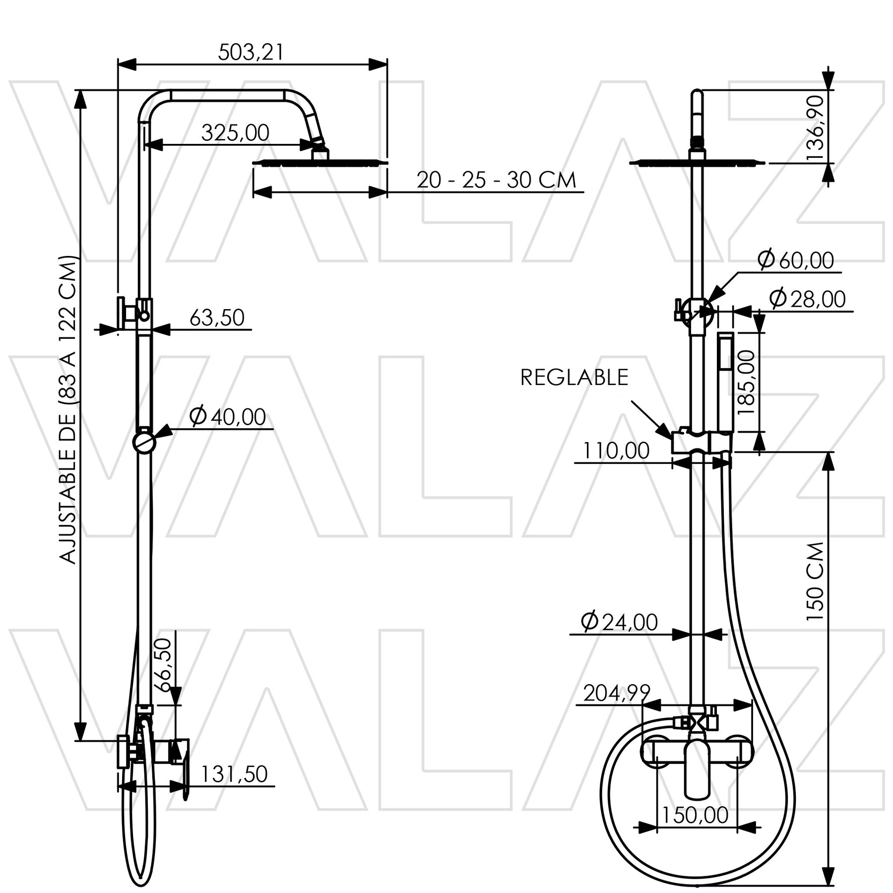 Colonne de douche réglable pour adapter la hauteur globale (80-120 cm), en acier inoxydable.