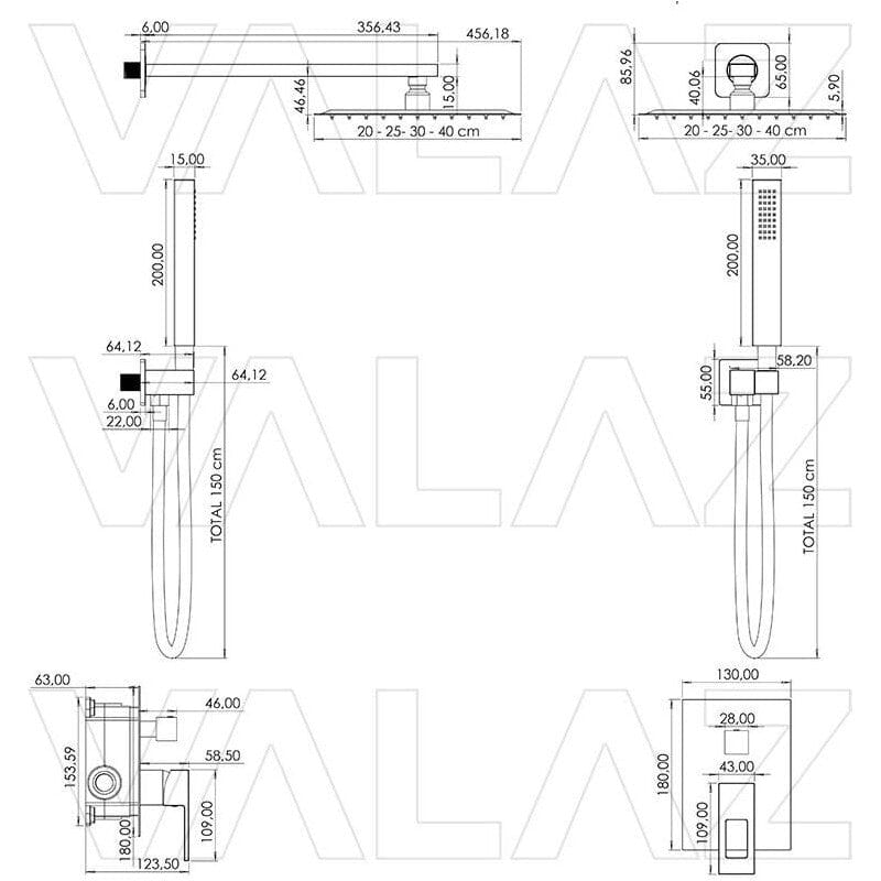 - Colonne de douche avec une tête de douche grand format, disponible en trois dimensions :