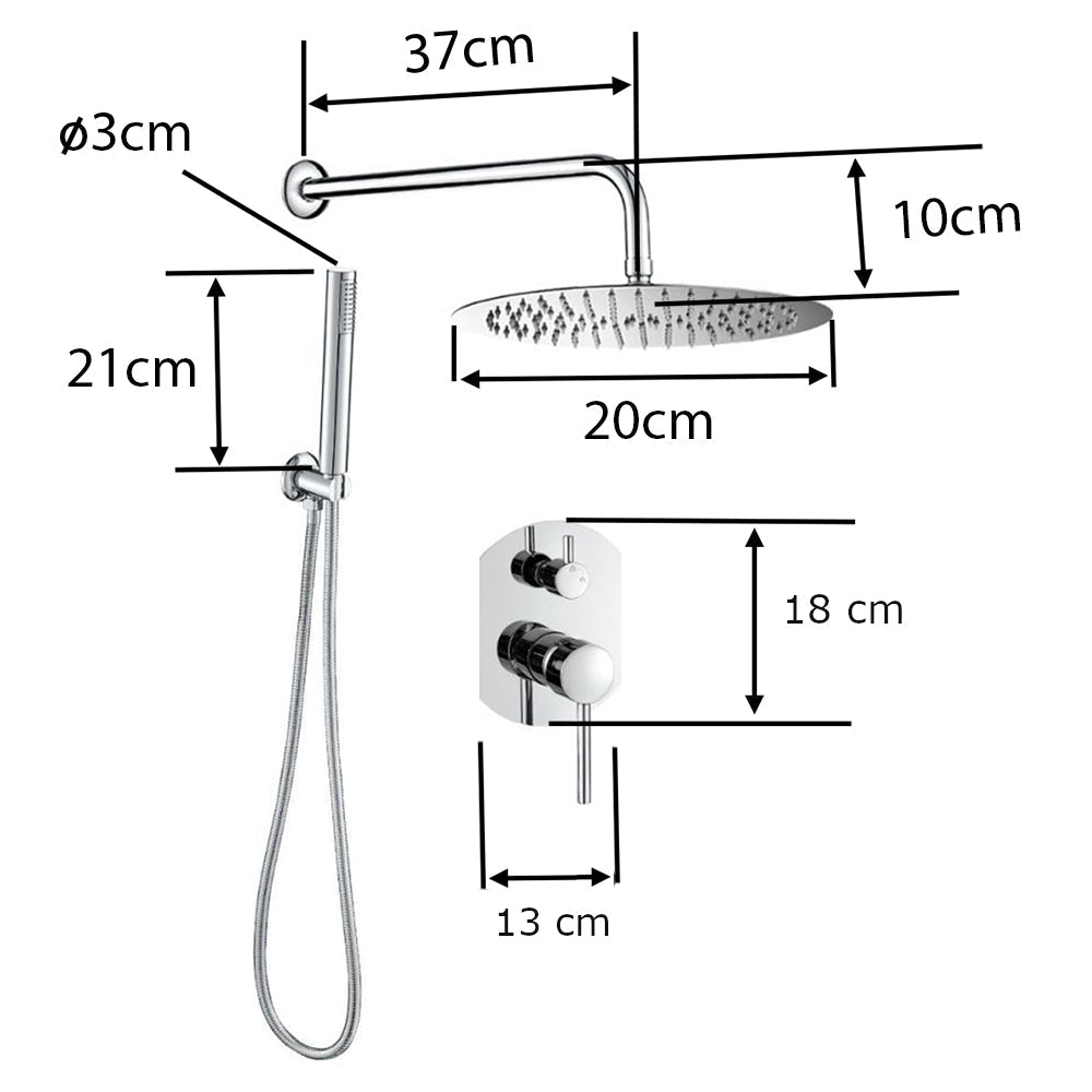 Une tête de douche en acier inoxydable, ronde, de diamètre 20 cm, extra-plat et anti-calcaire ;