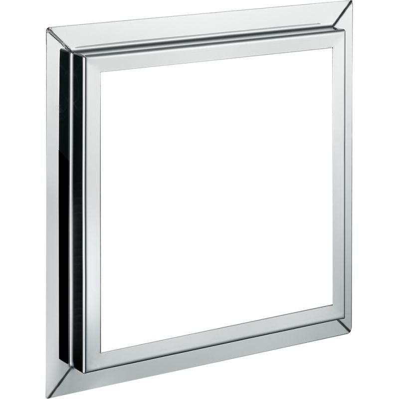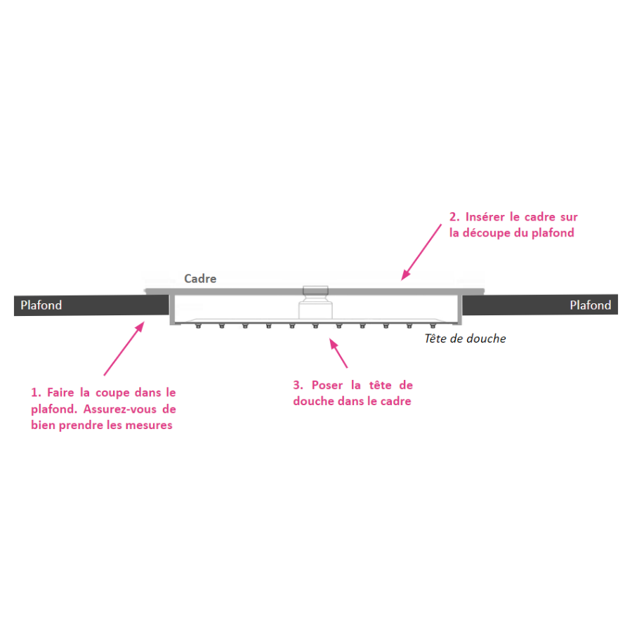 Une tête de douche en acier inoxydable, carrée de côté 30 cm, extra-plat et anti-calcaire ; elle est à encastrer à ras du plafond.