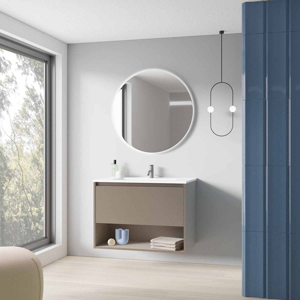- Miroir NOZOMI rond avec lumière intégrée, pour le meuble de largeur 80 cm. Il comprend un verre poli circulaire incorporant une bande de LED illuminant l'arrière du miroir. Dimensions : 75 cm de diamètre et 2,5 cm de profondeur.