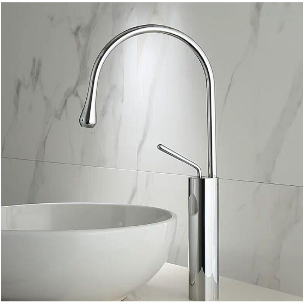 Robinet mitigeur rehaussé pour lavabo ou vasque, finition chromée et bec pivotant.