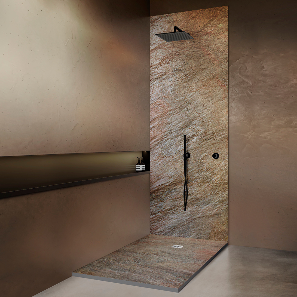 Le panneau de douche est composé d’une couche de pierre naturelle ardoise de 2 mm associée à une âme en verre cellulaire isolante, garantissant légèreté, solidité et performance thermique.