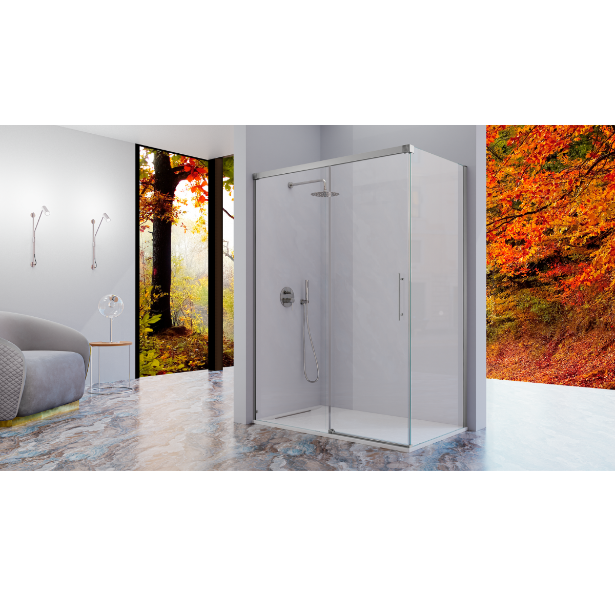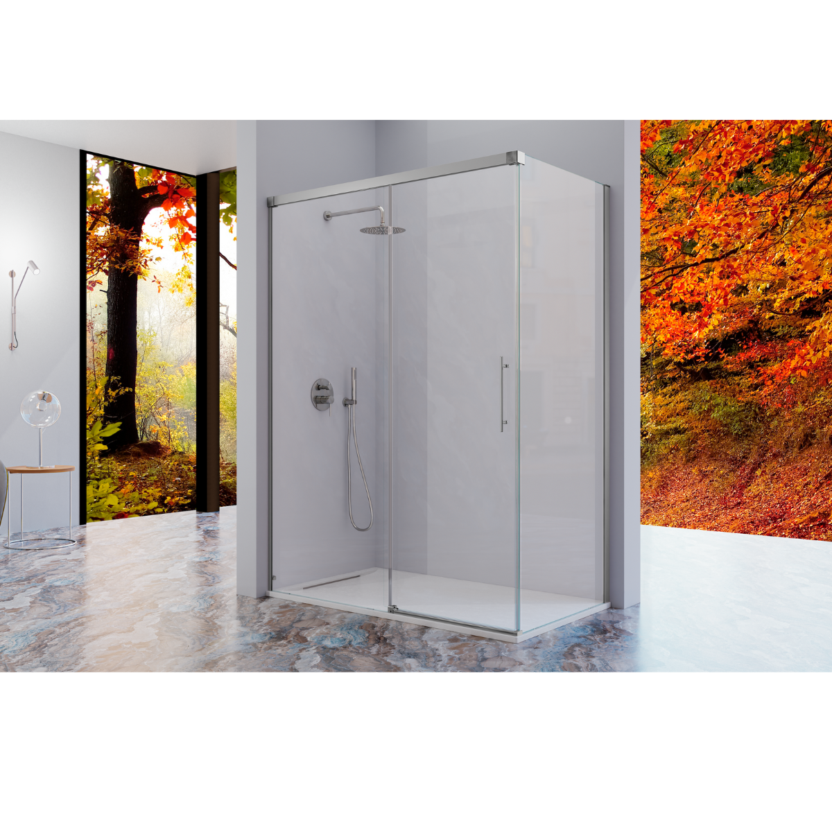 Panneau de douche fixe avec porte coulissante, modèle URBAN, de longueur 100 cm à 180 cm.