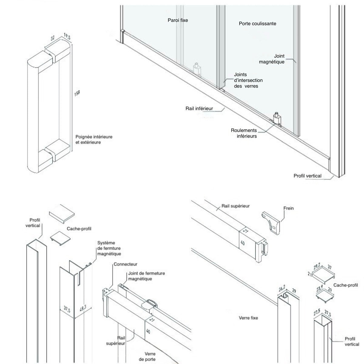 Ce modèle existe avec des profils chromé, noir mat. Il existe également avec une paroi latérale, profils chromé et noir mat.