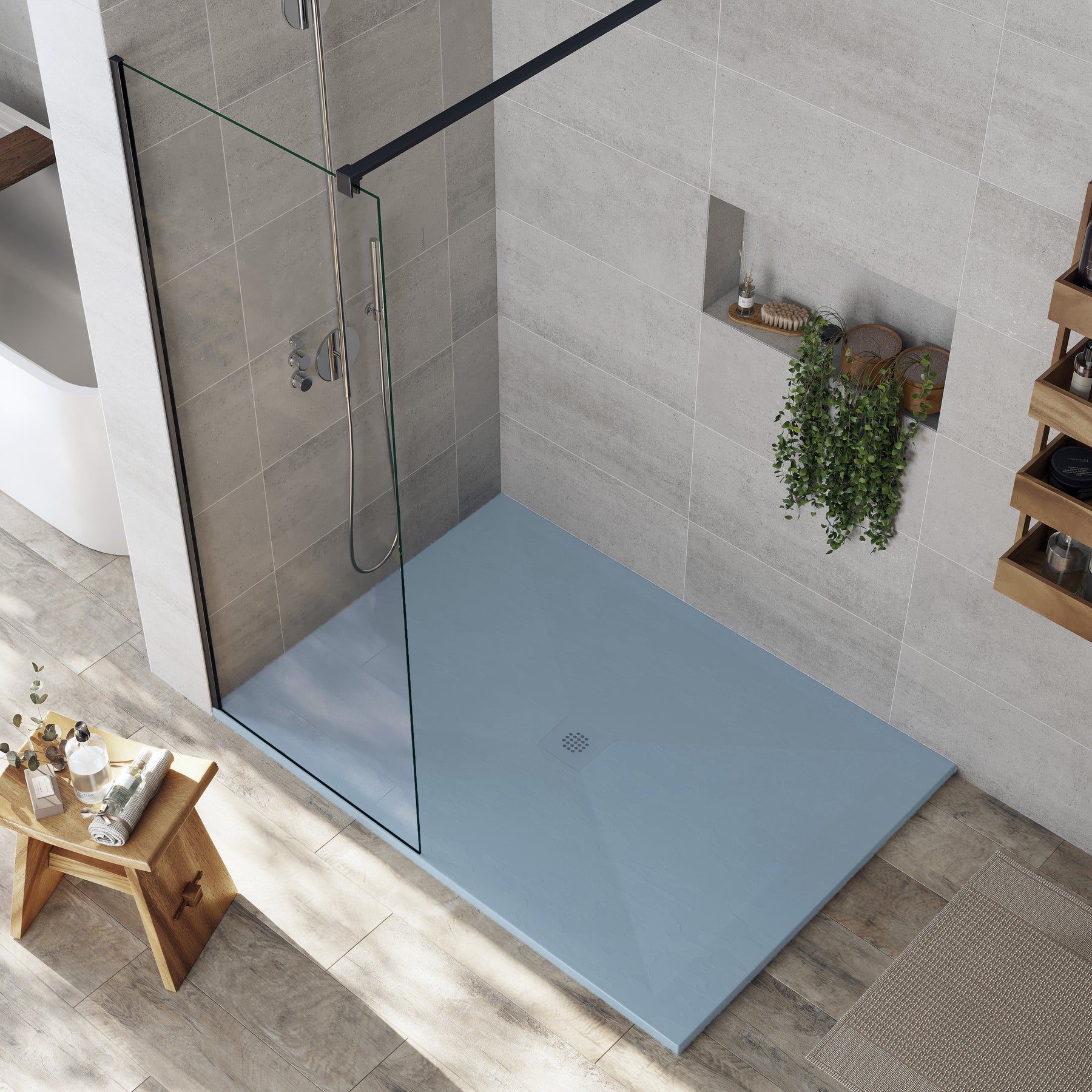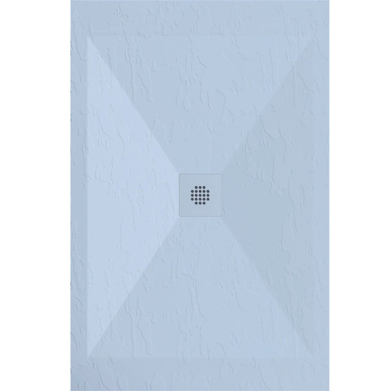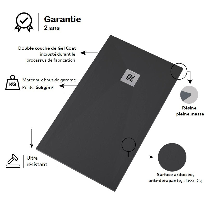 Receveur de douche en résine polyester de 3 cm d'épaisseur avec une concentration maximale de particules minérales de dolomite et de carbonate, coloré et recouvert d'une double couche de gelcoat.