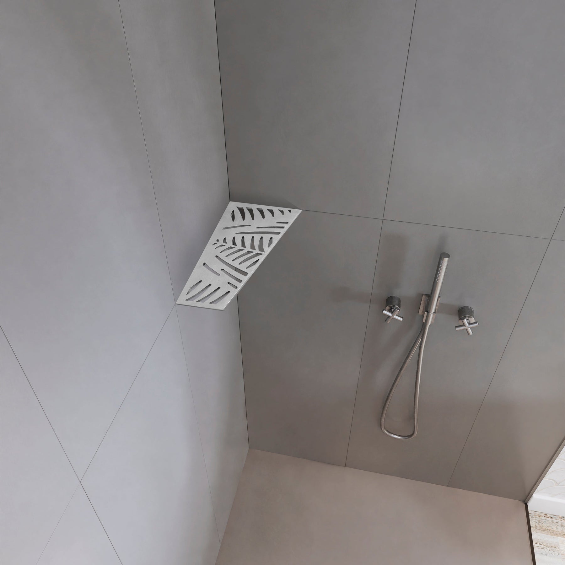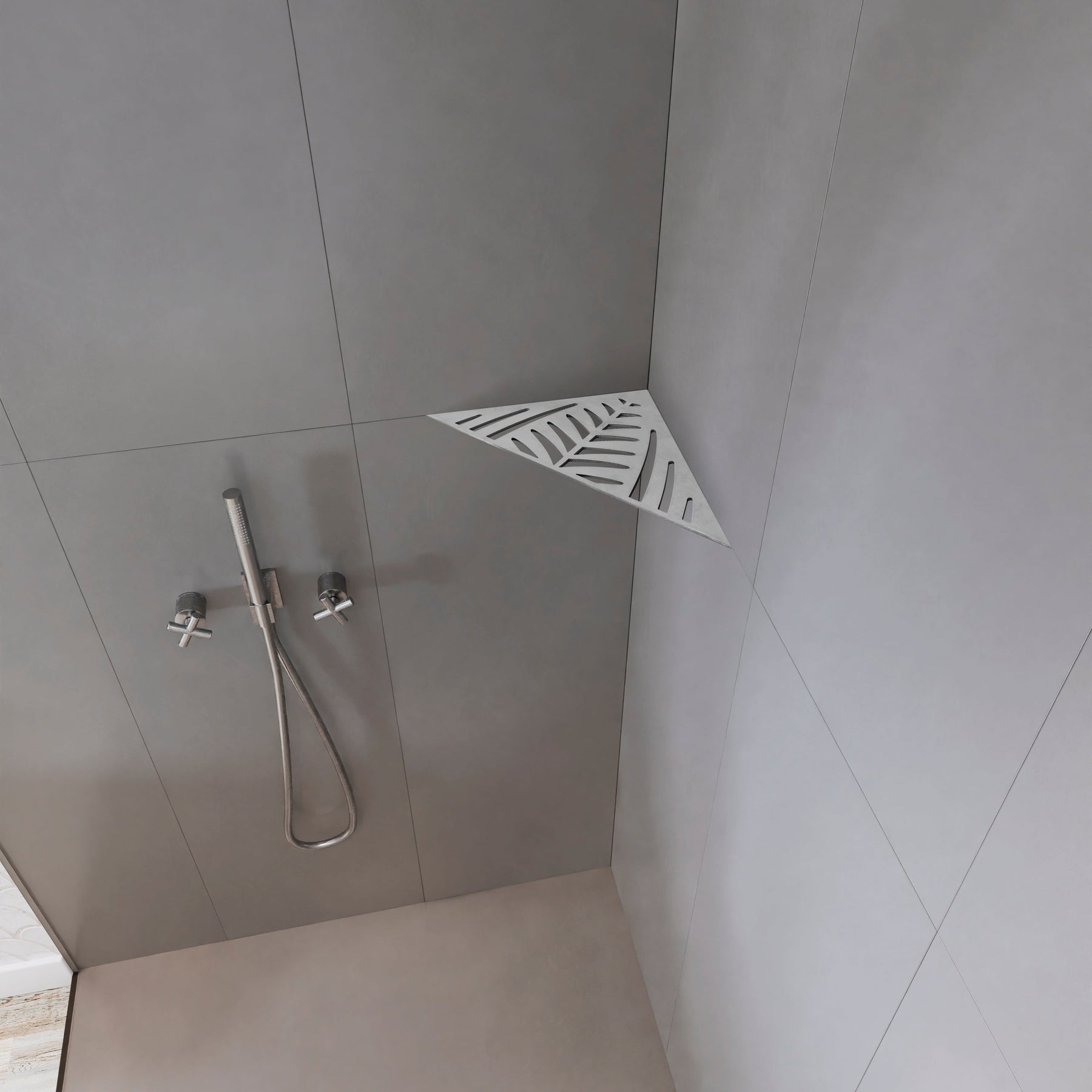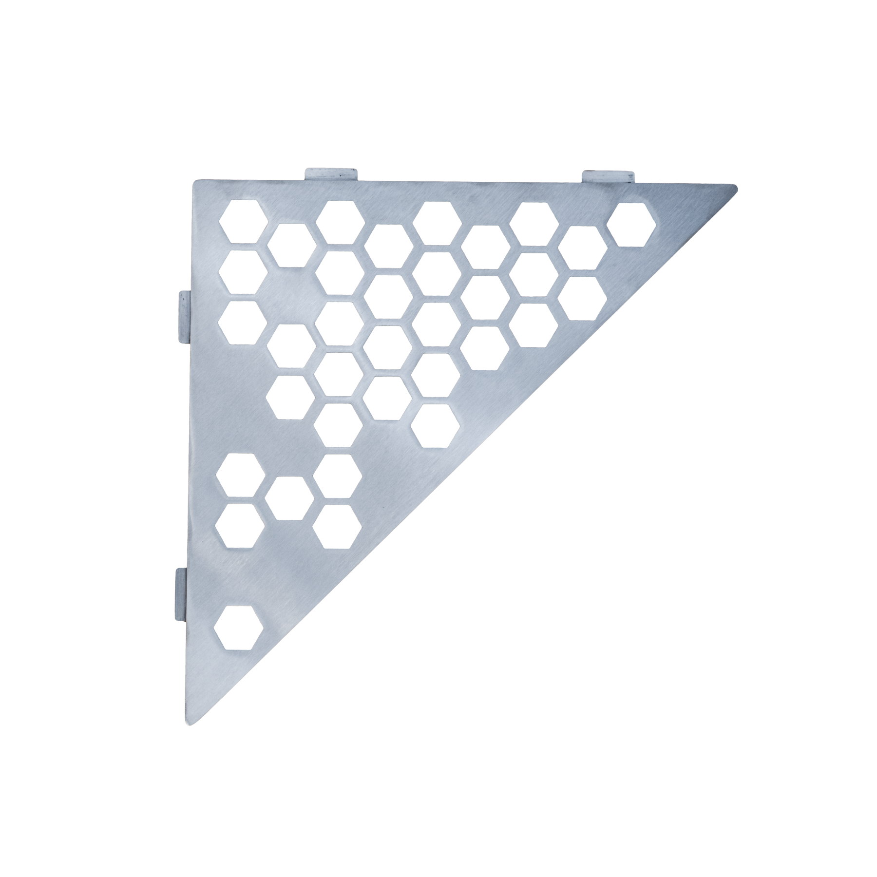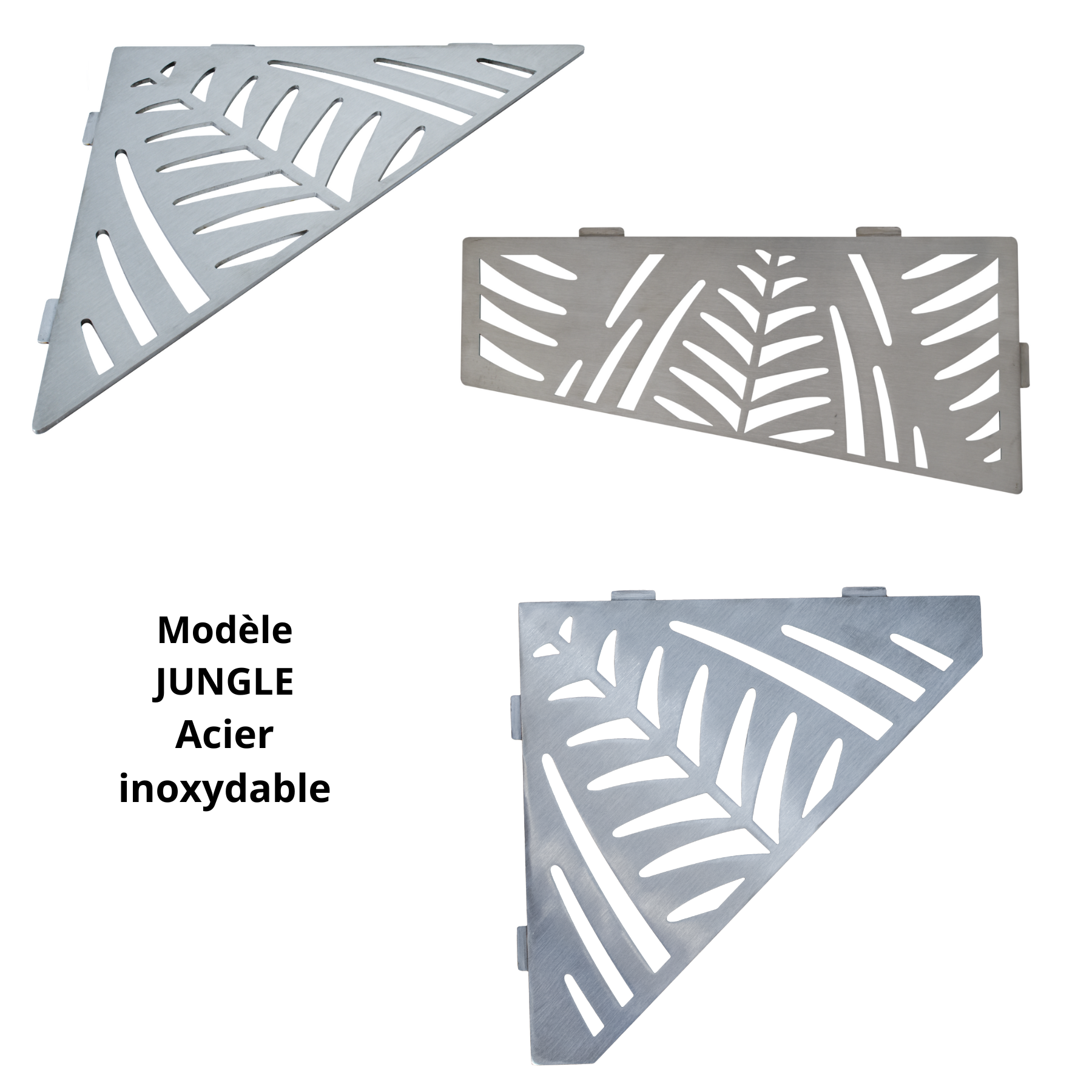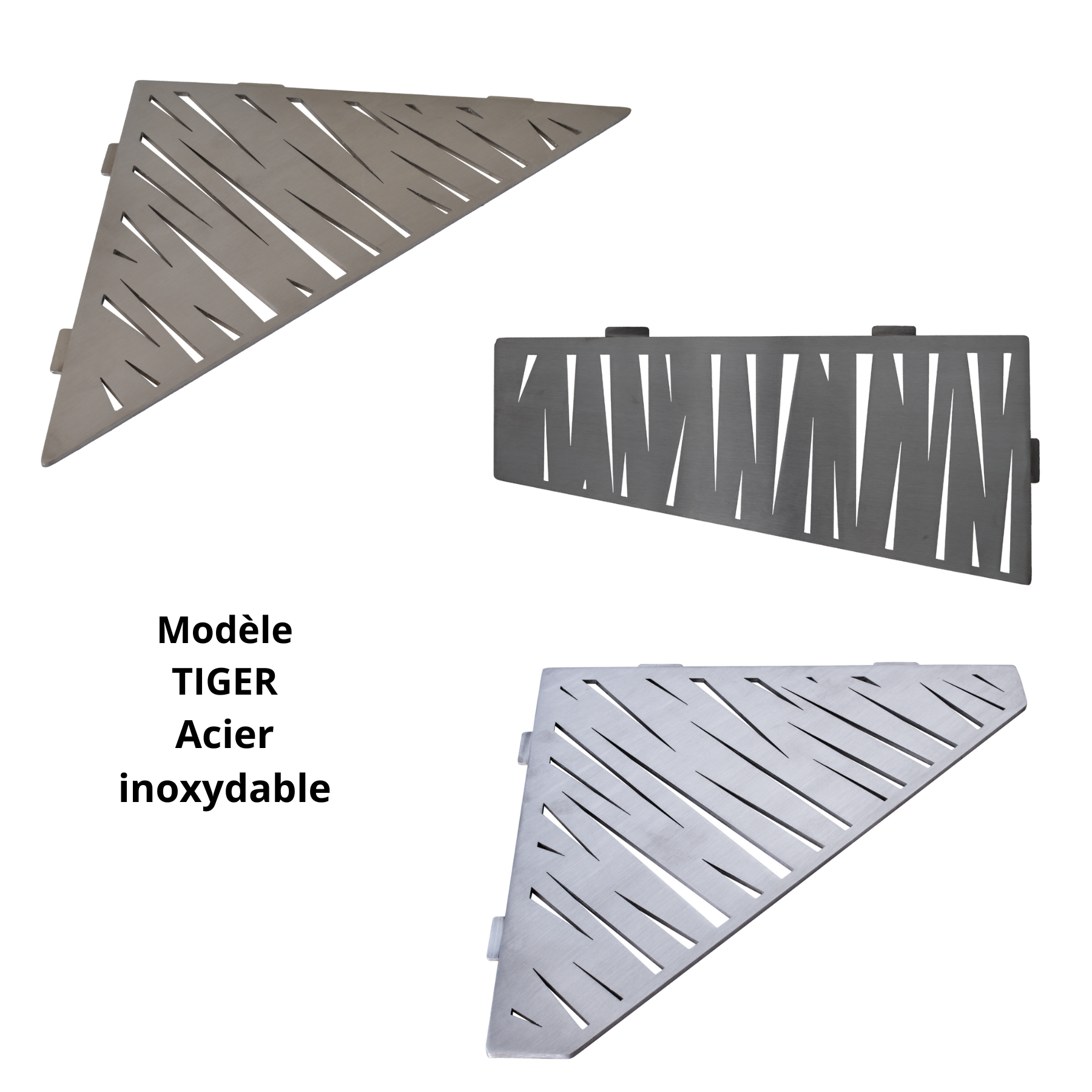 Tablettes d'angle, à fixer aux joints de carrelage, 12 modèles, acier inoxydable brossé, pour tout type de salle de bain.