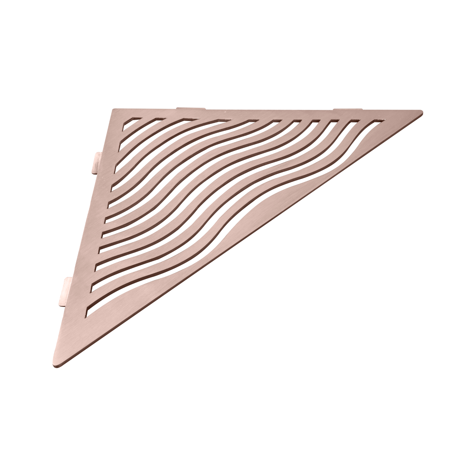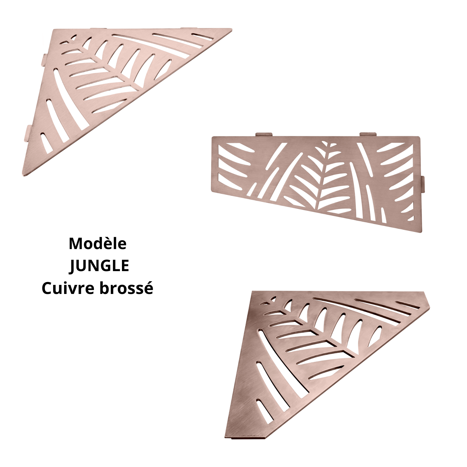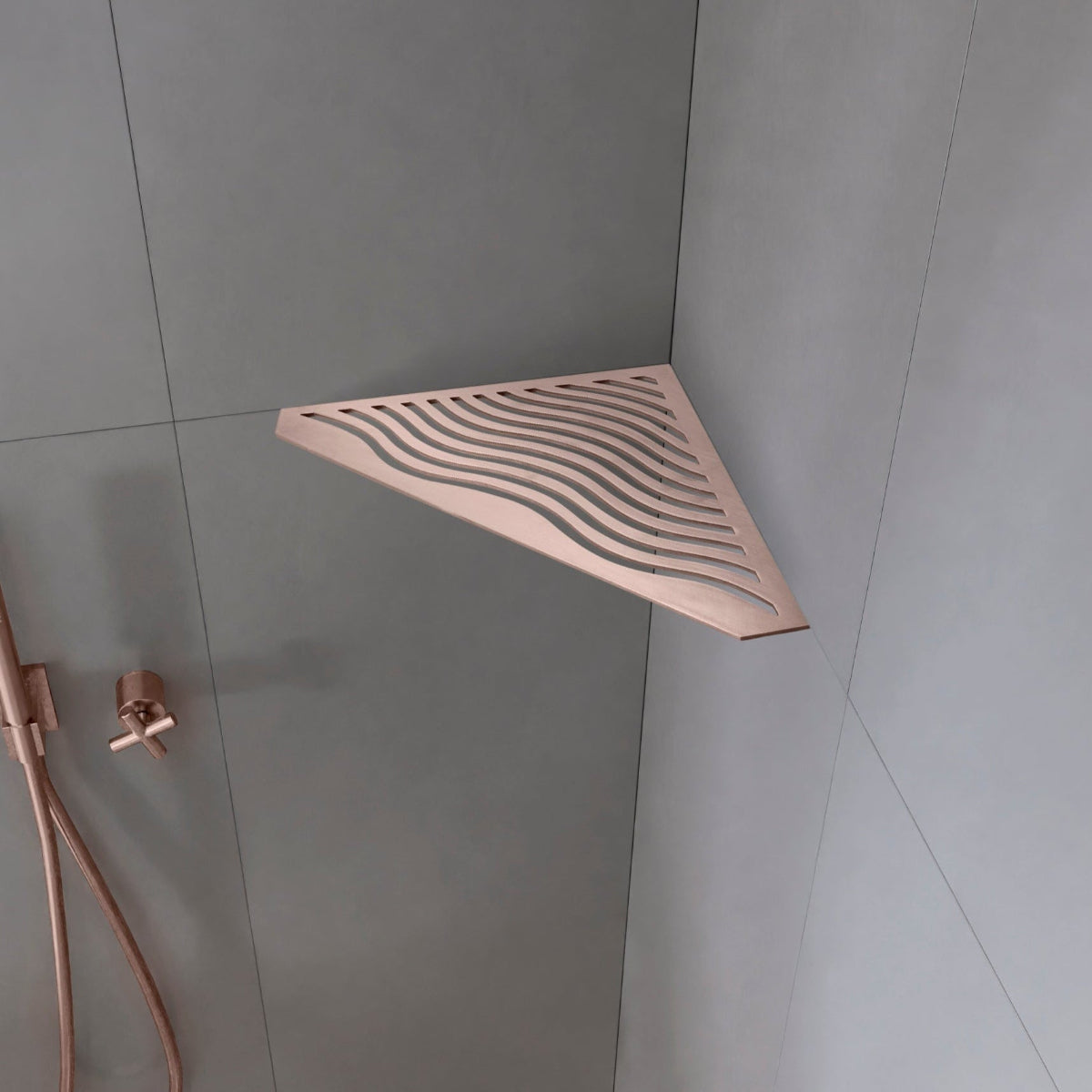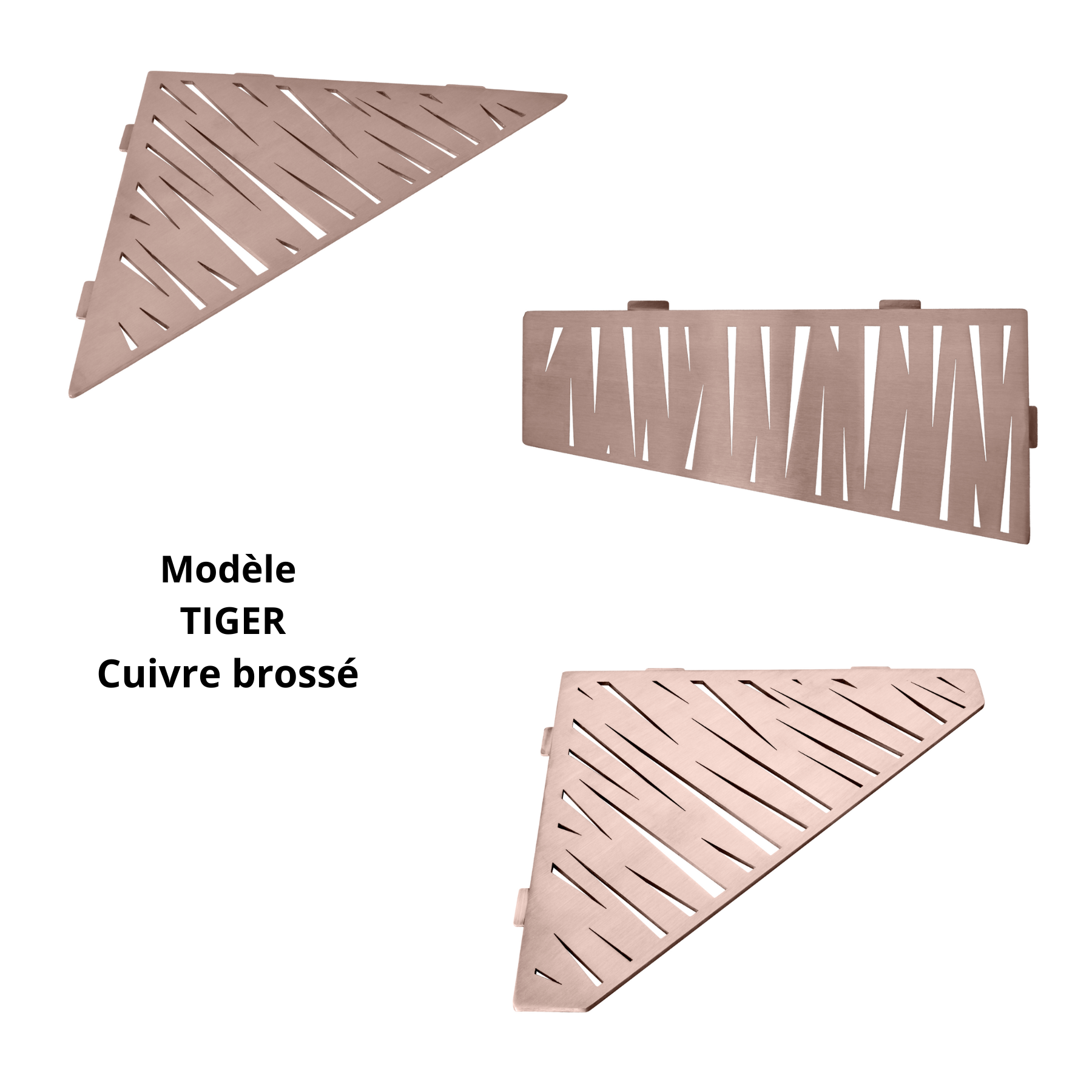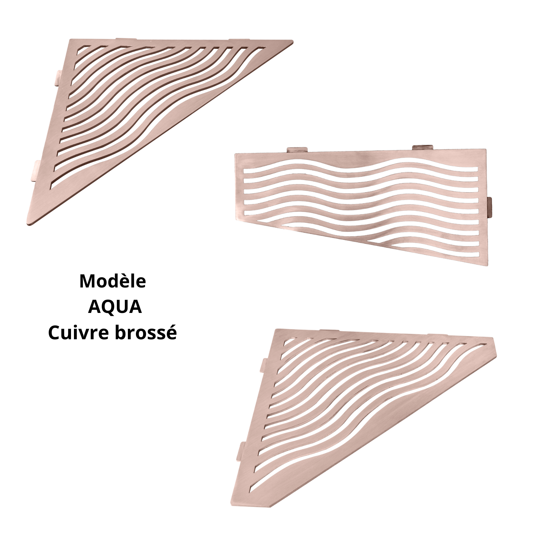 Tablettes d'angle, à fixer aux joints de carrelage, 12 modèles, PVD cuivre brossé, pour tout type de salle de bain.