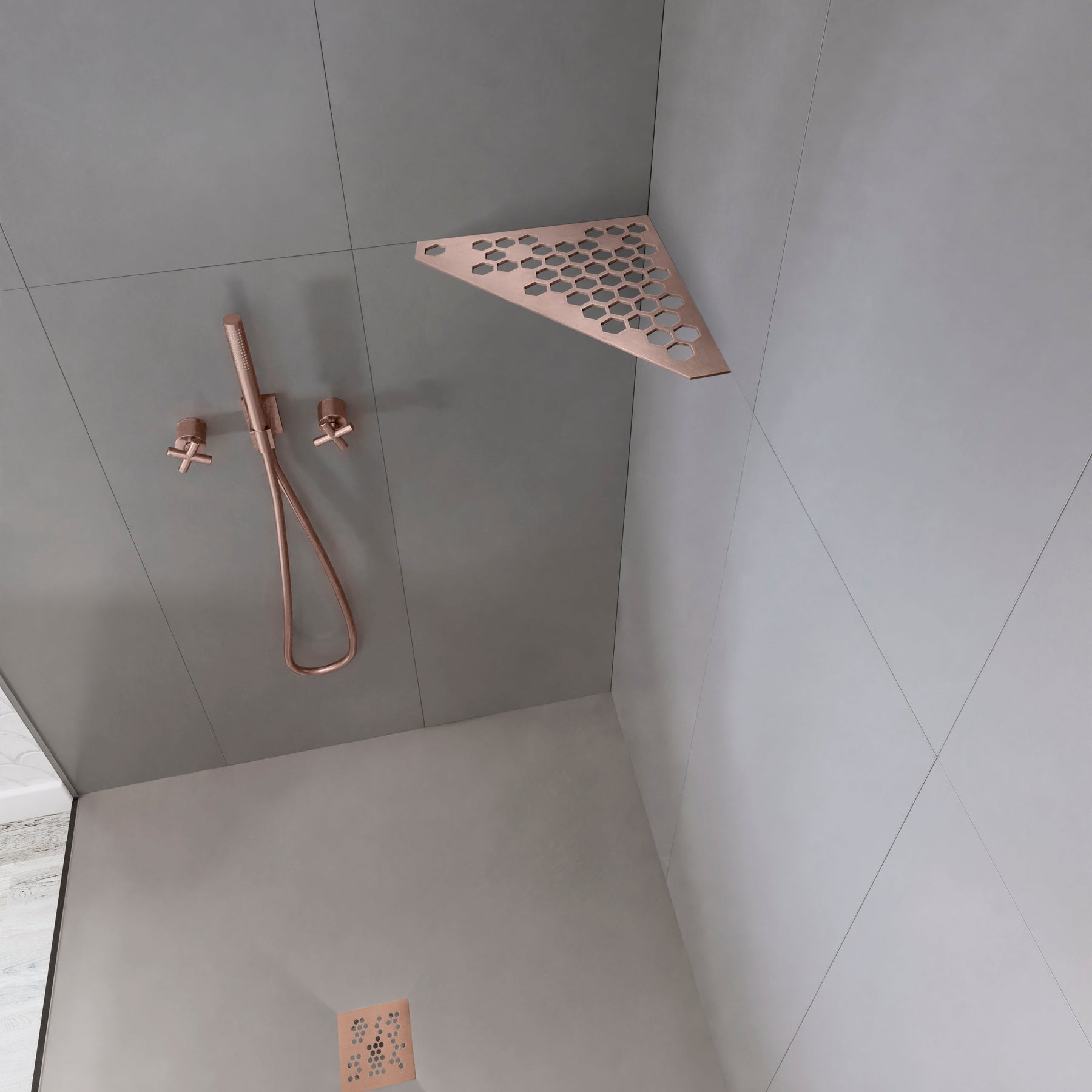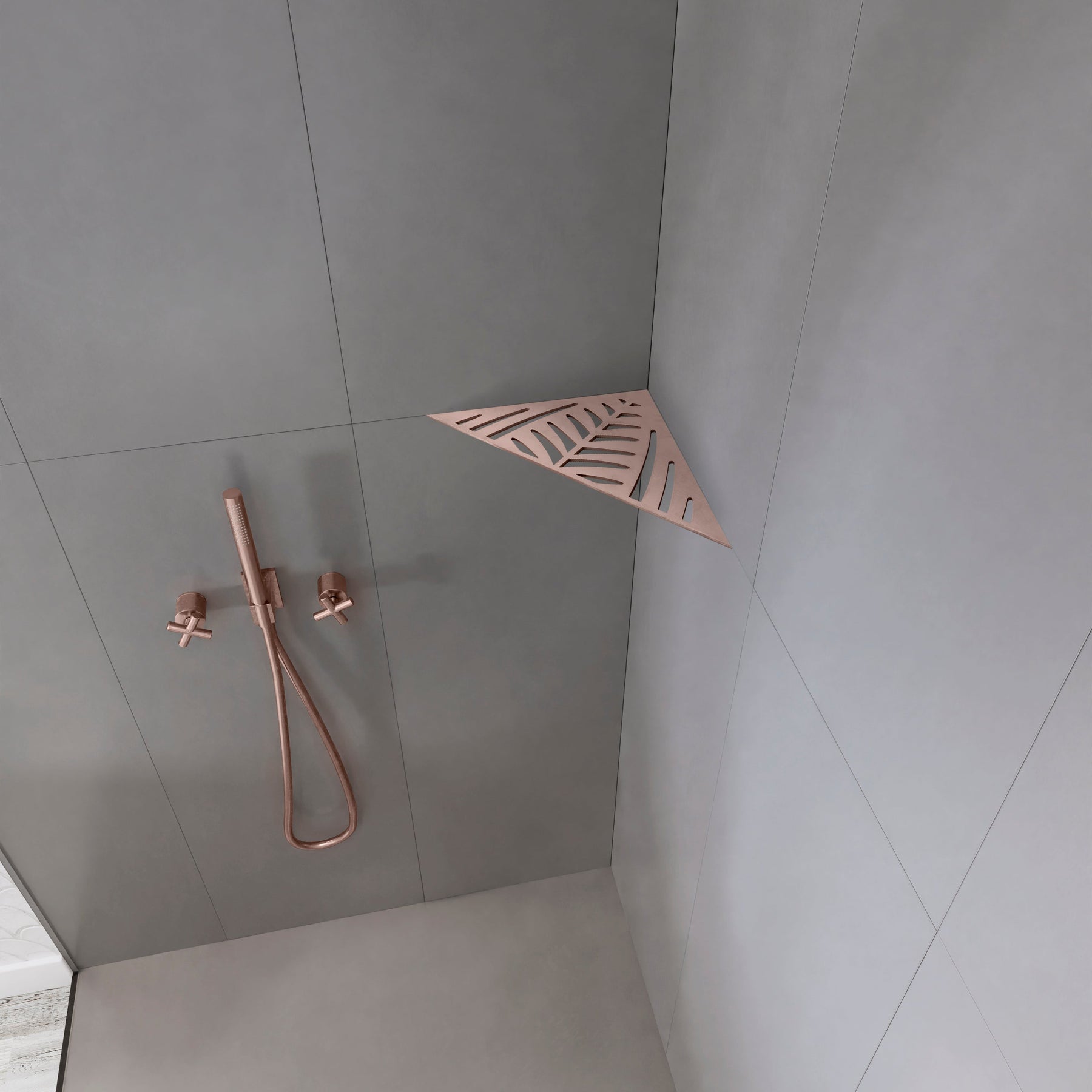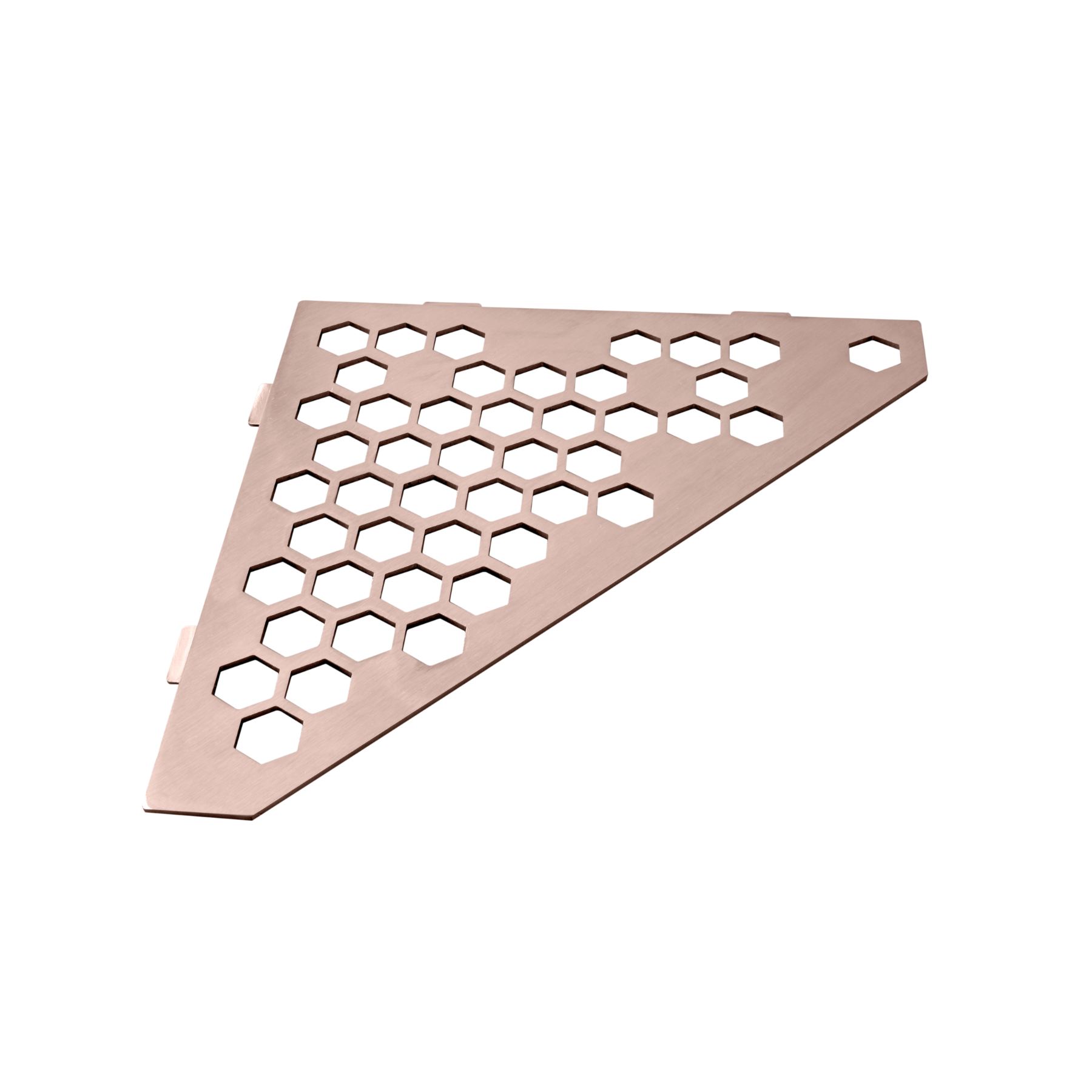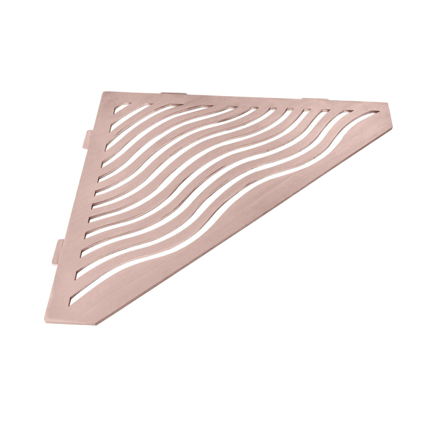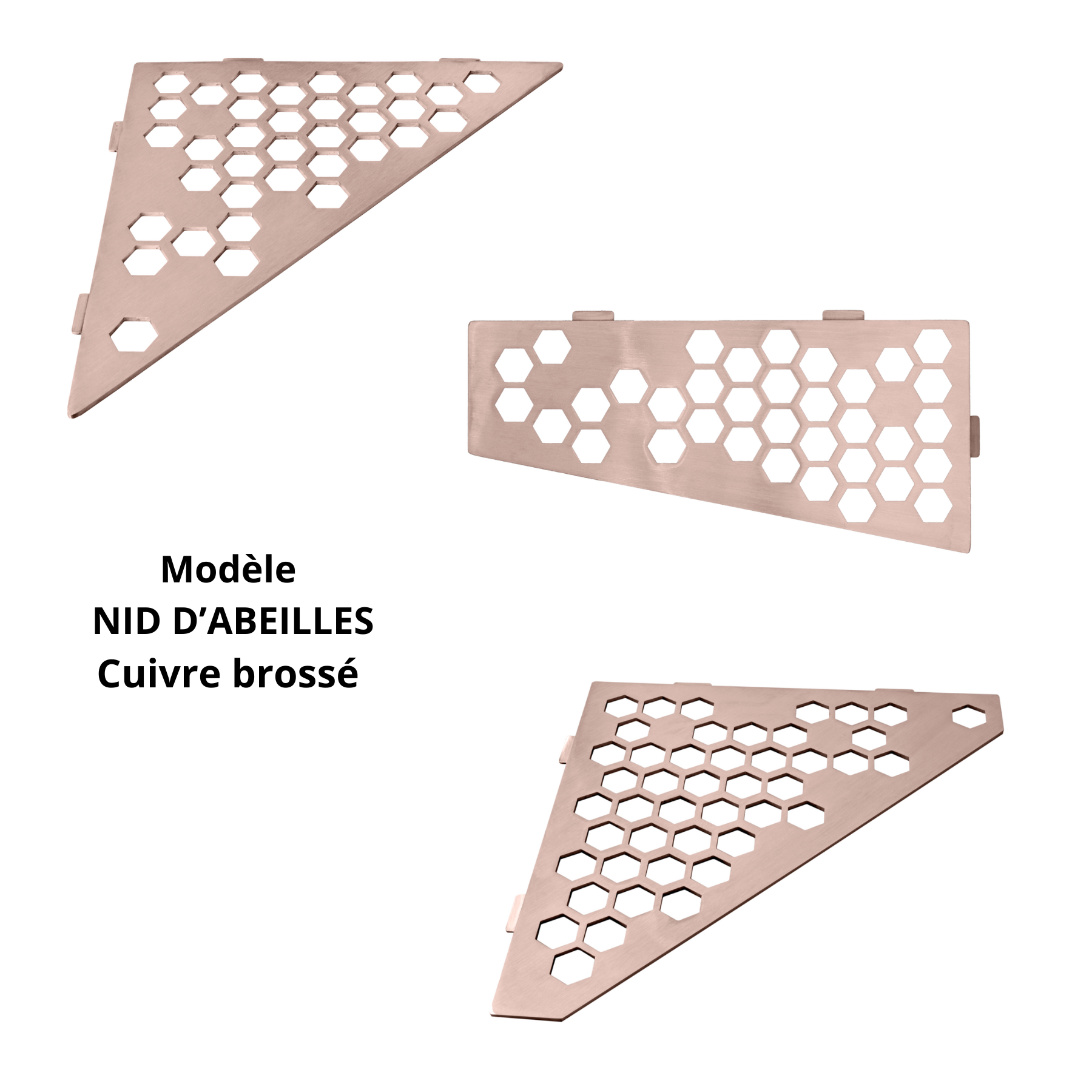 Tablettes d'angle, à fixer aux joints de carrelage, 12 modèles, PVD cuivre brossé, pour tout type de salle de bain.
