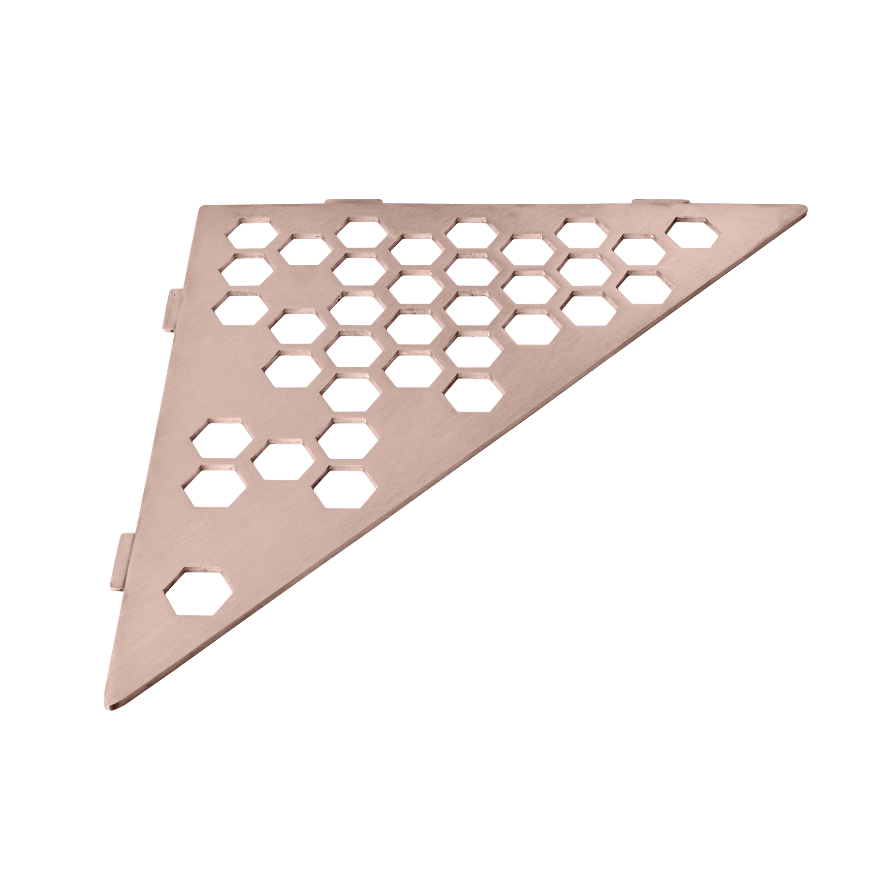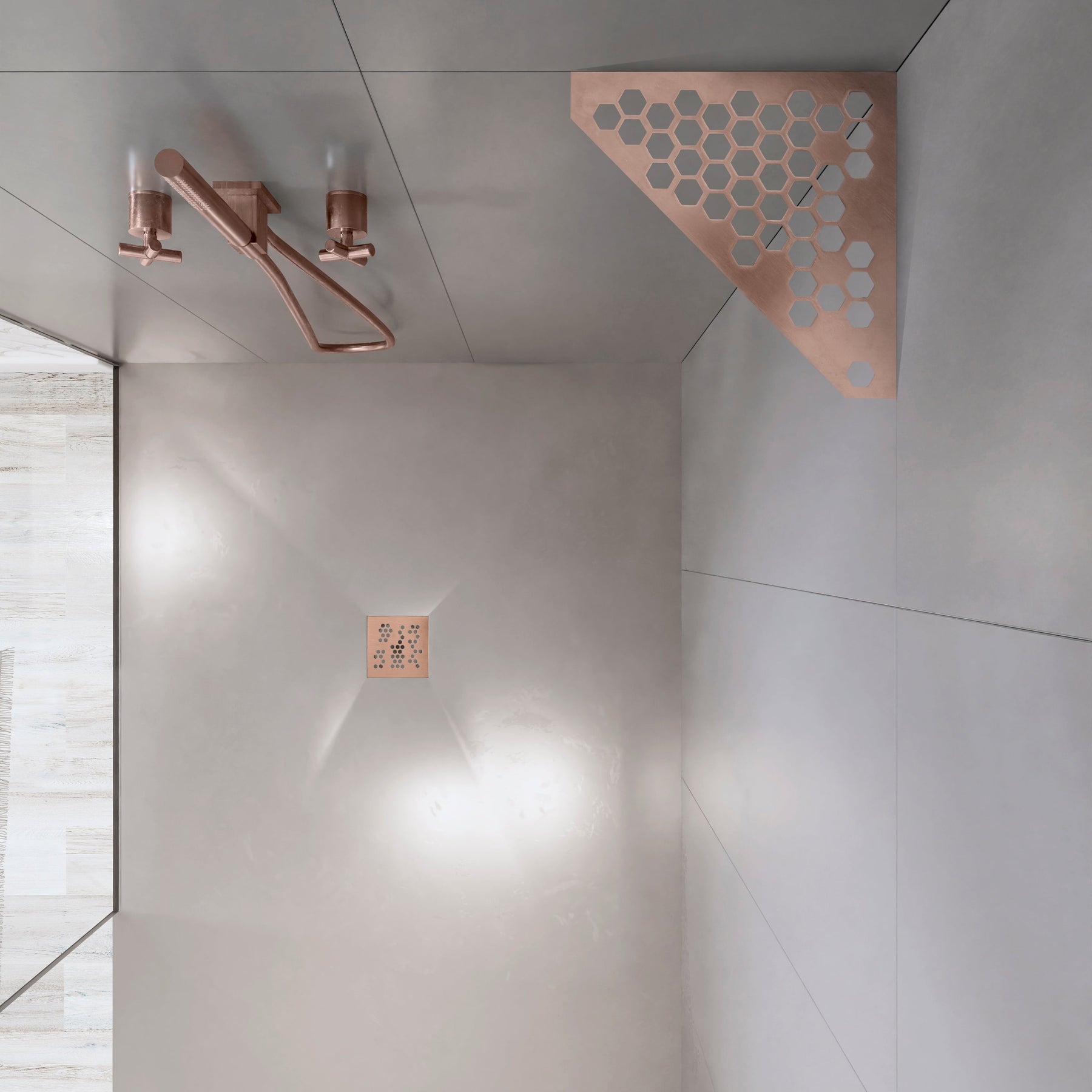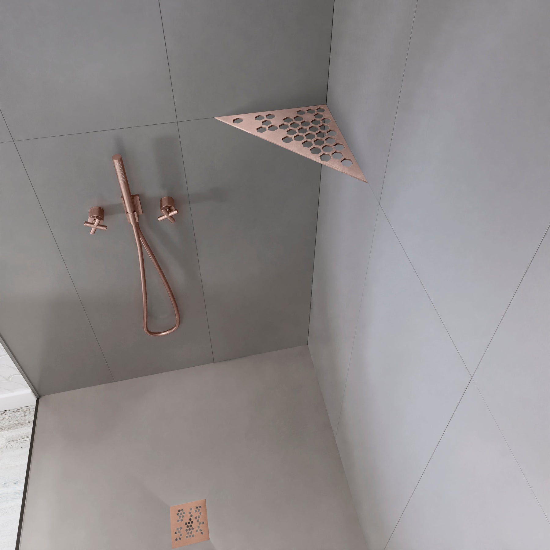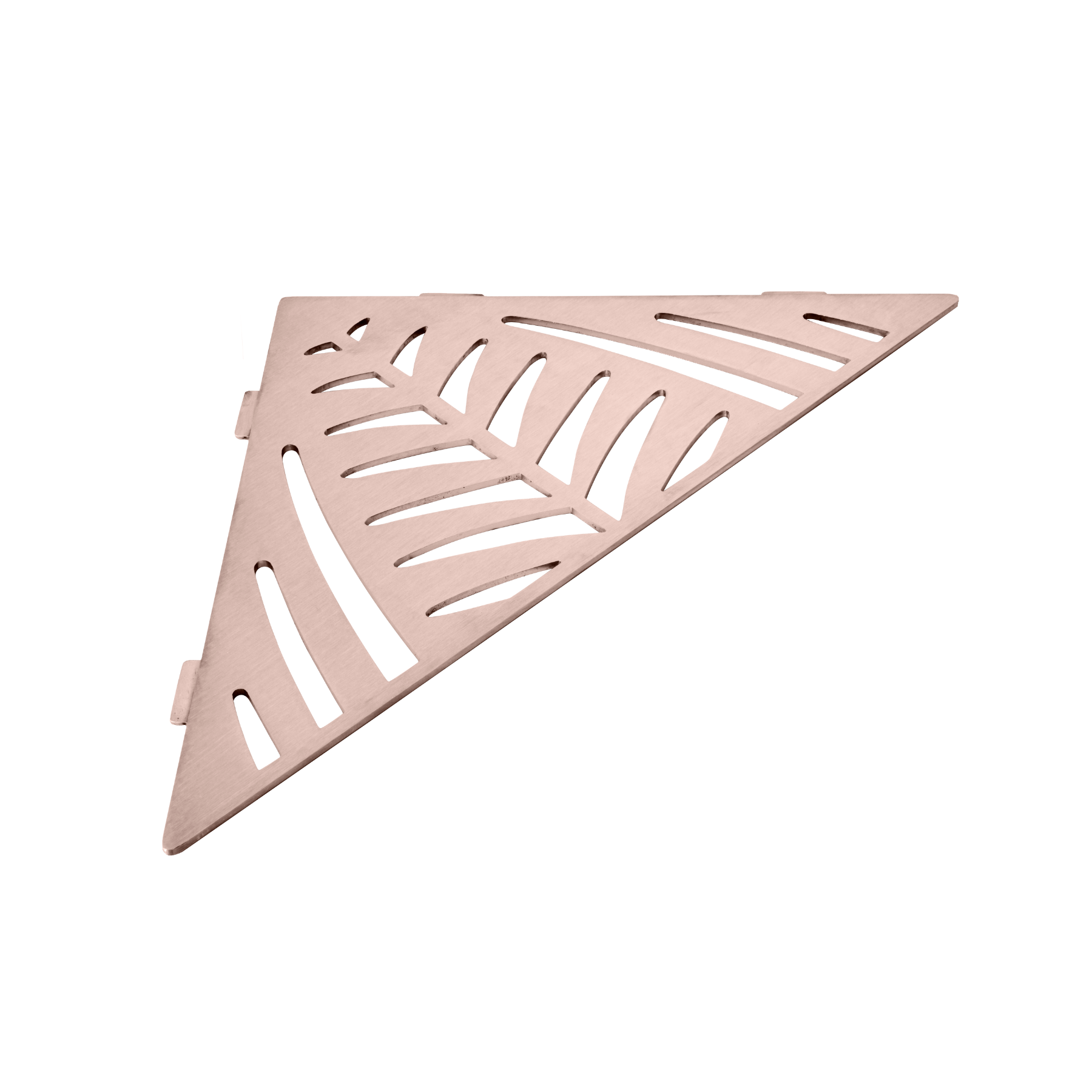 Tablettes d'angle, à fixer aux joints de carrelage, 12 modèles, PVD cuivre brossé, pour tout type de salle de bain.