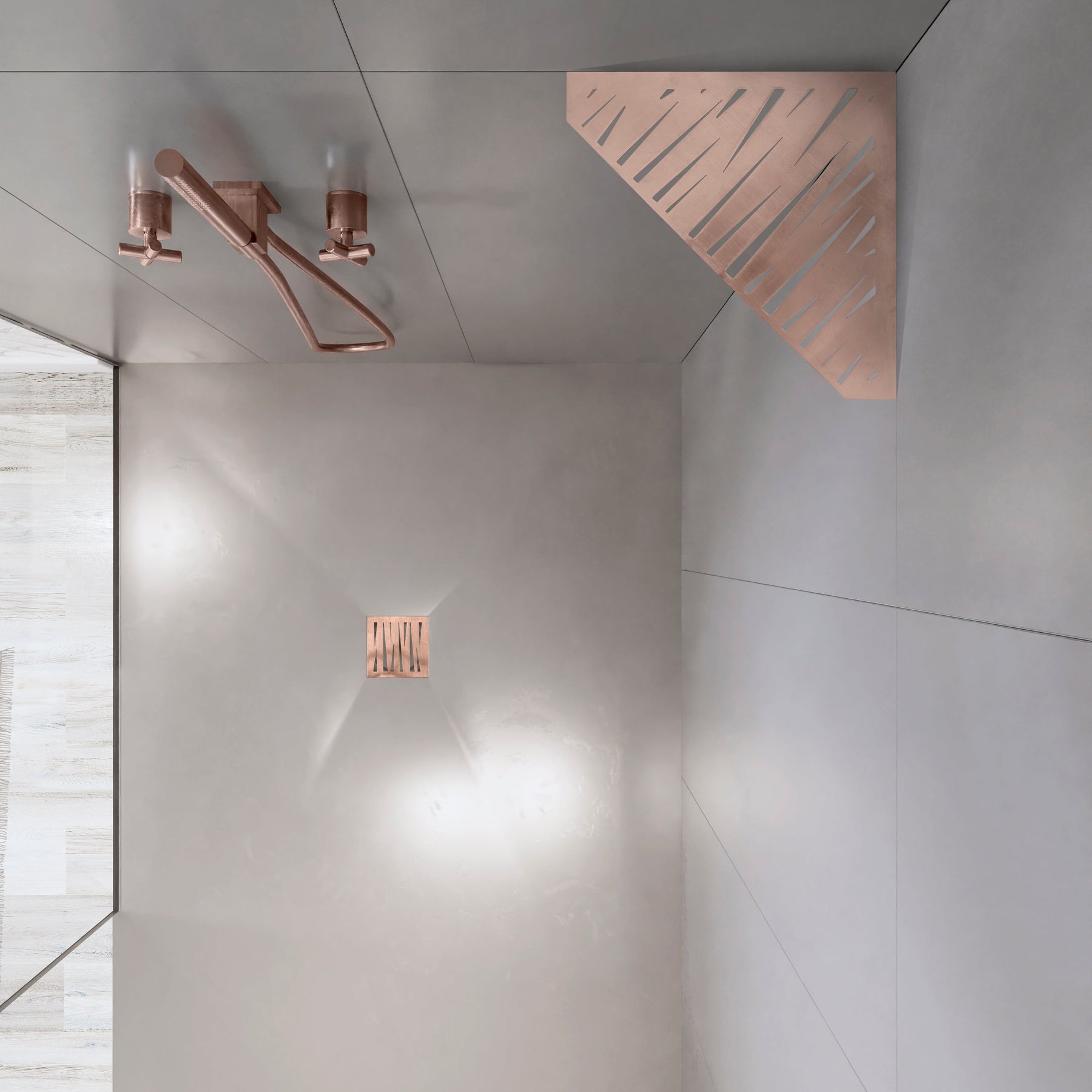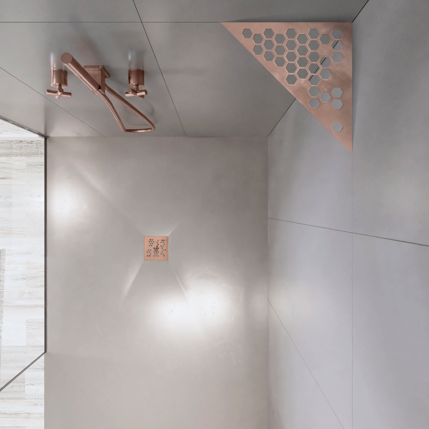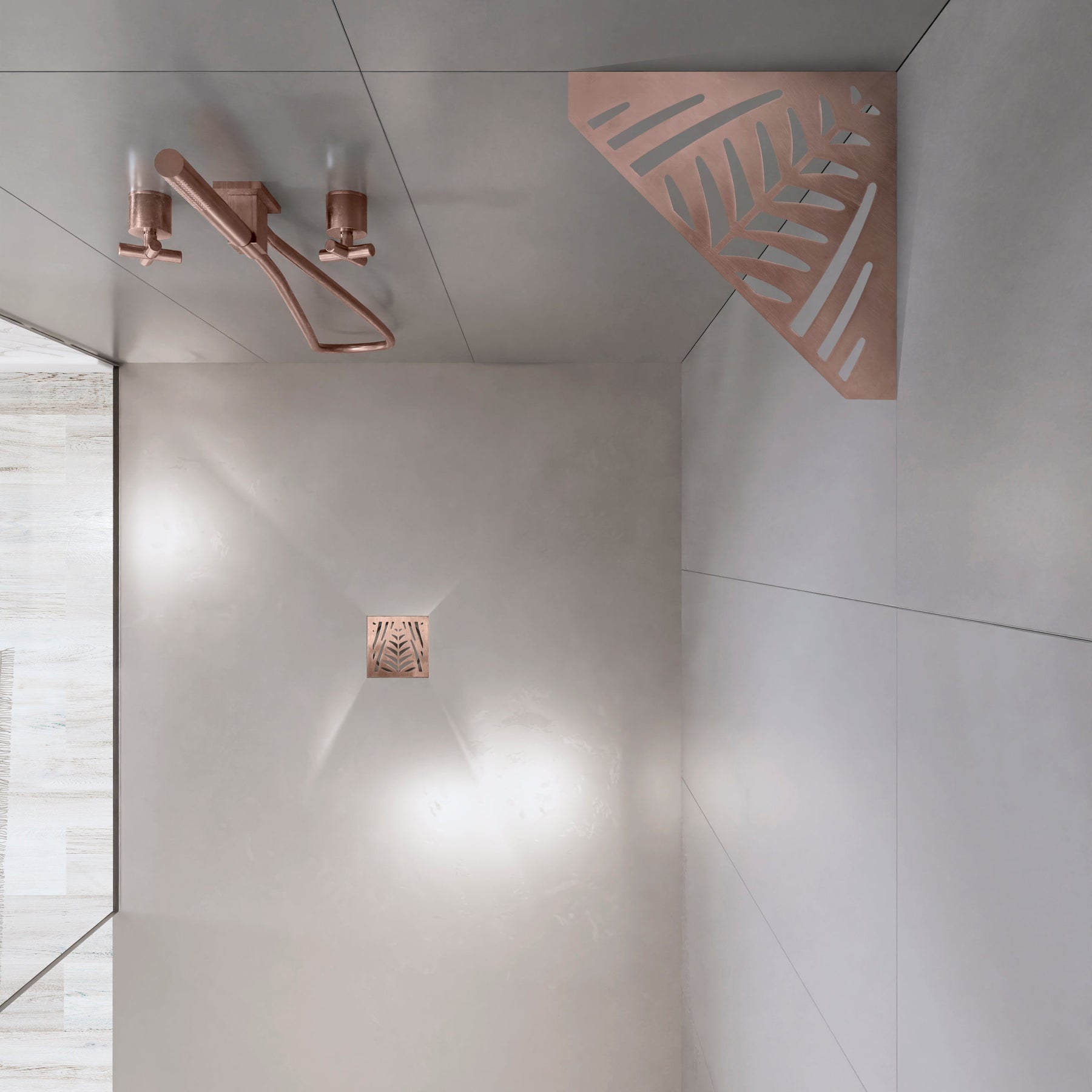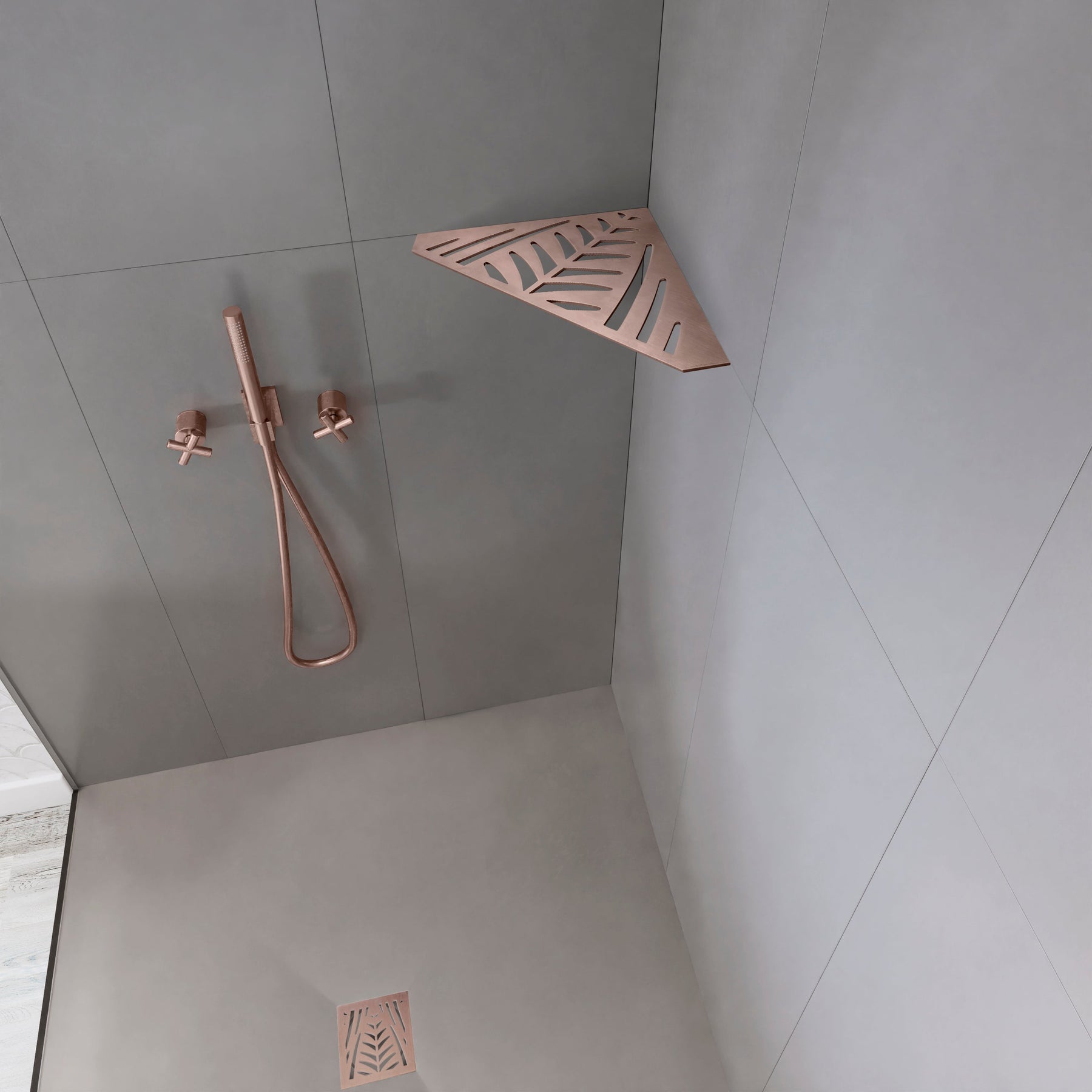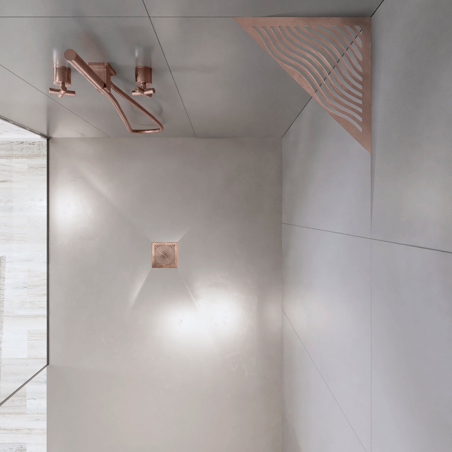 Tablettes d'angle, à fixer aux joints de carrelage, 12 modèles, PVD cuivre brossé, pour tout type de salle de bain.