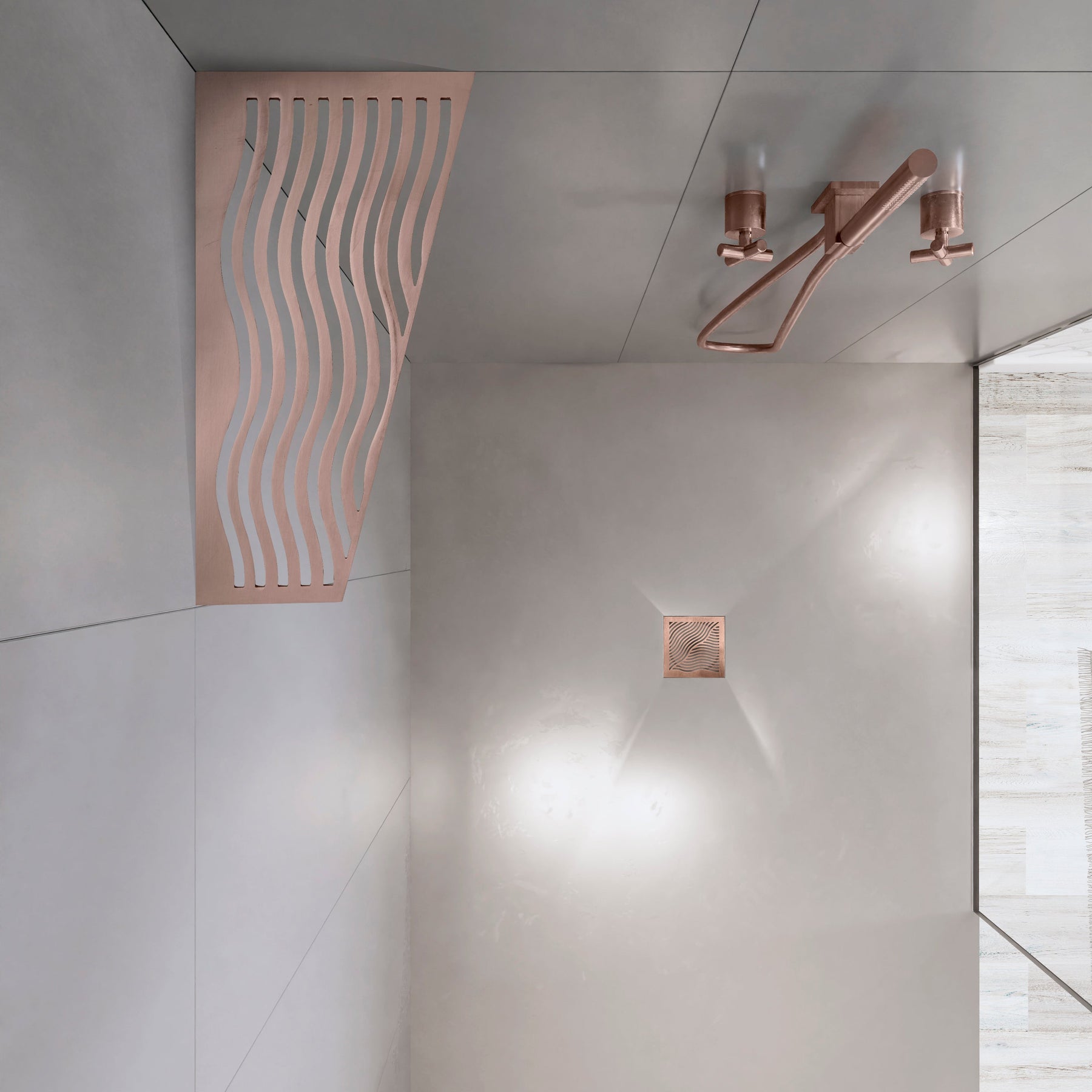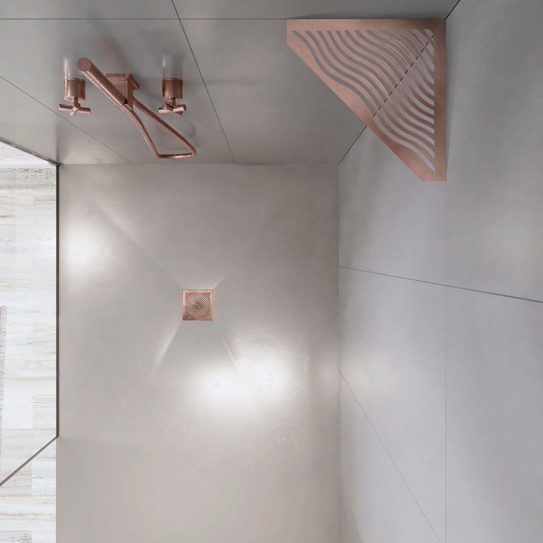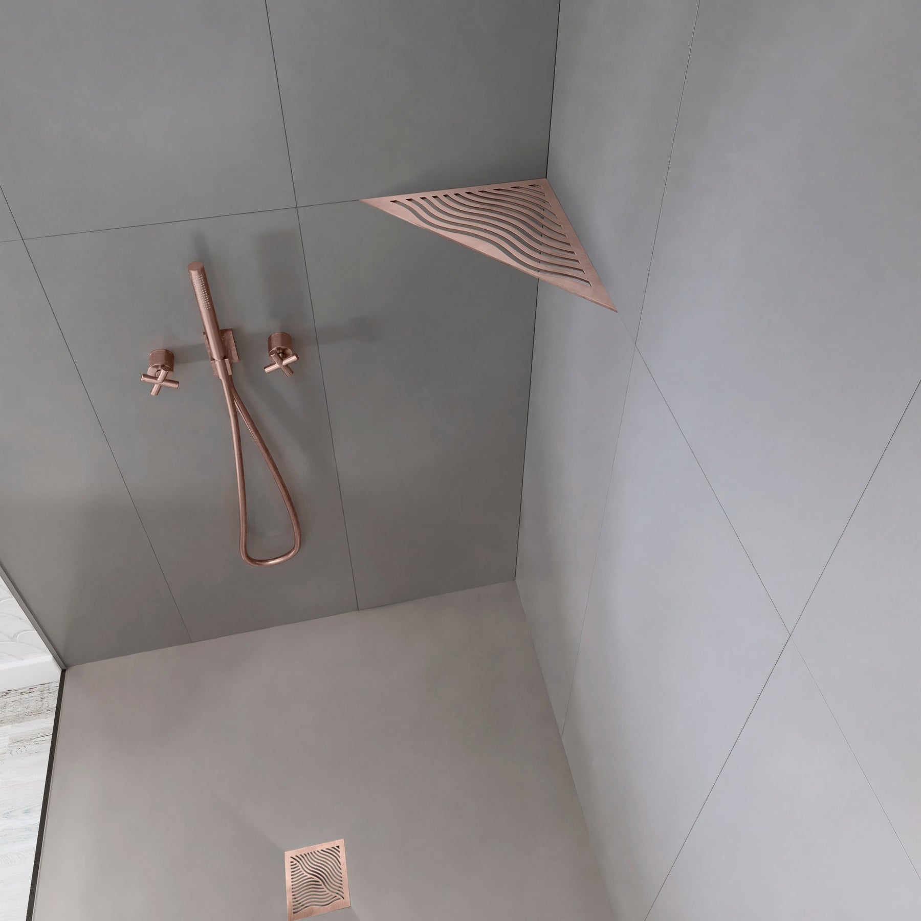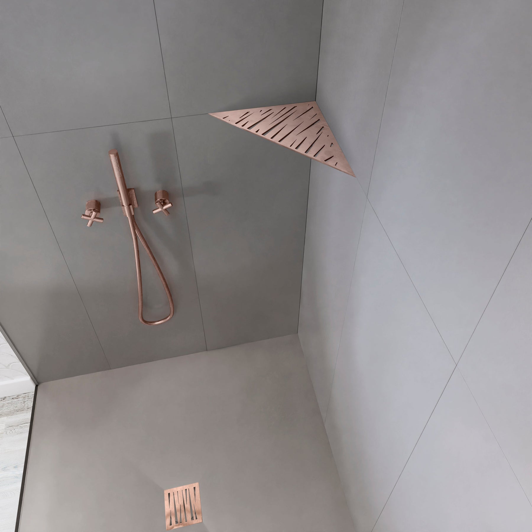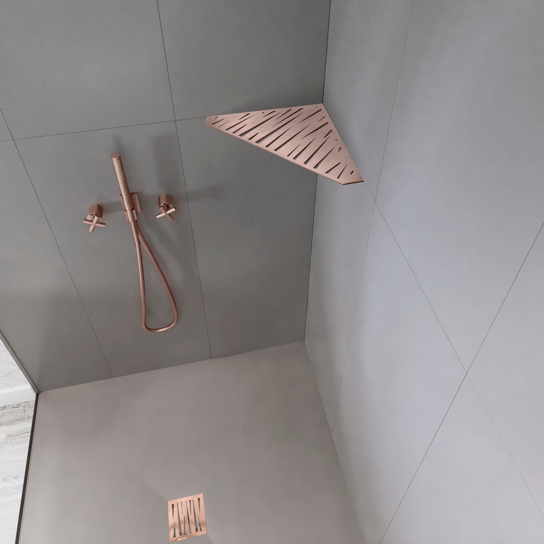 Tablettes d'angle, à fixer aux joints de carrelage, 12 modèles, PVD cuivre brossé, pour tout type de salle de bain.