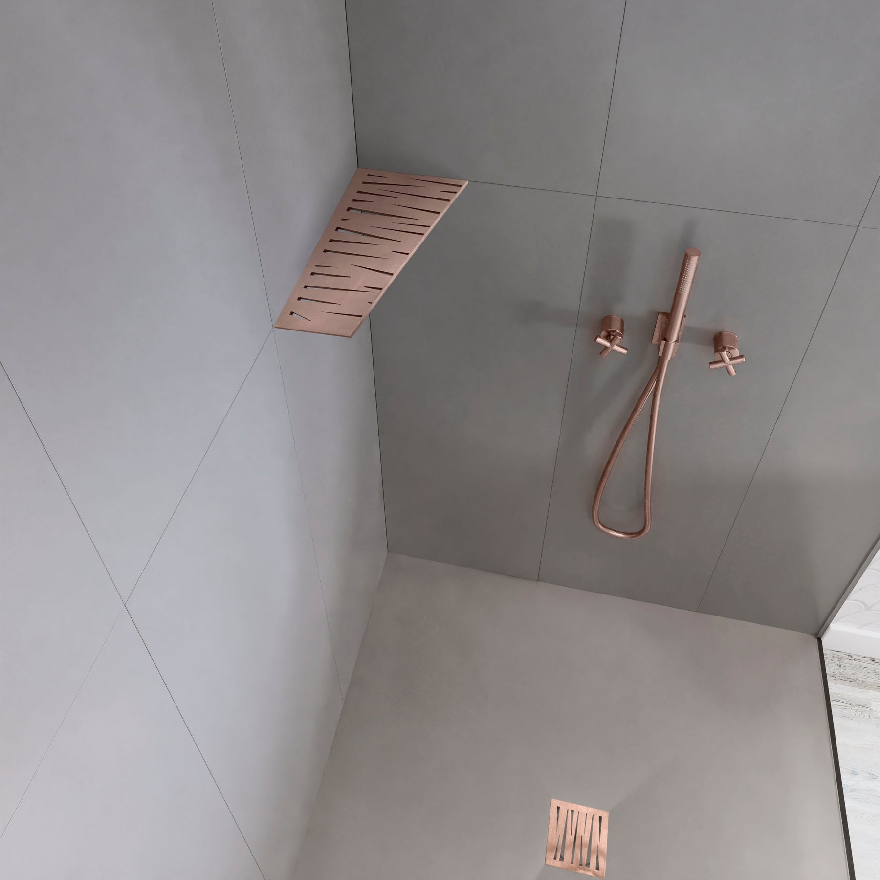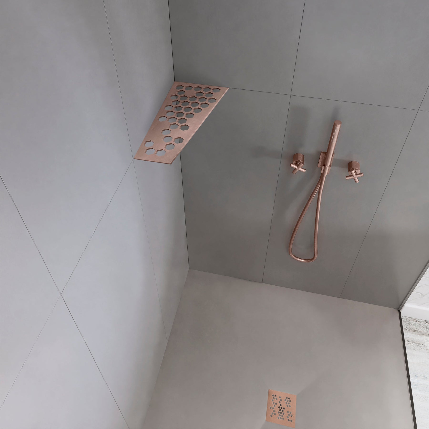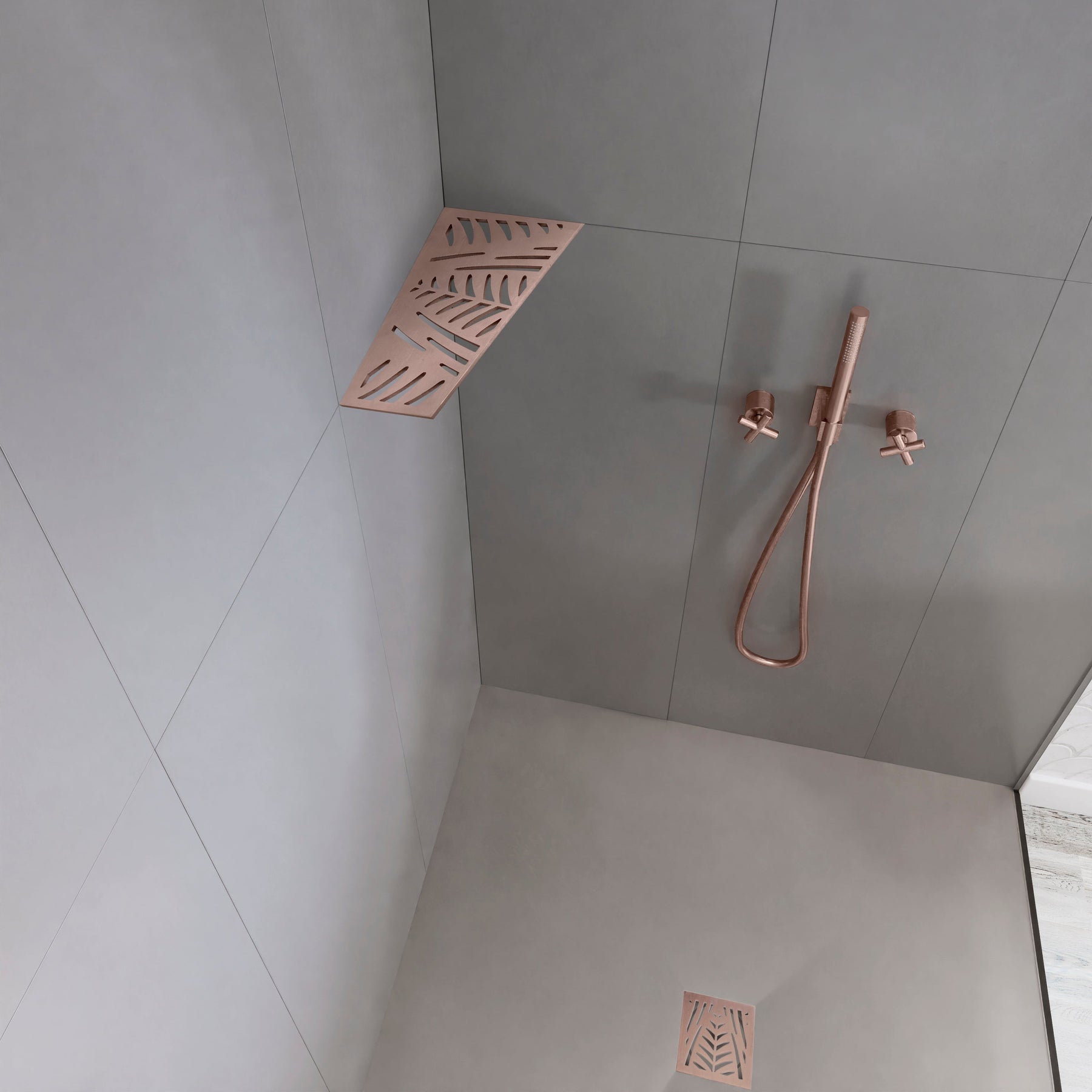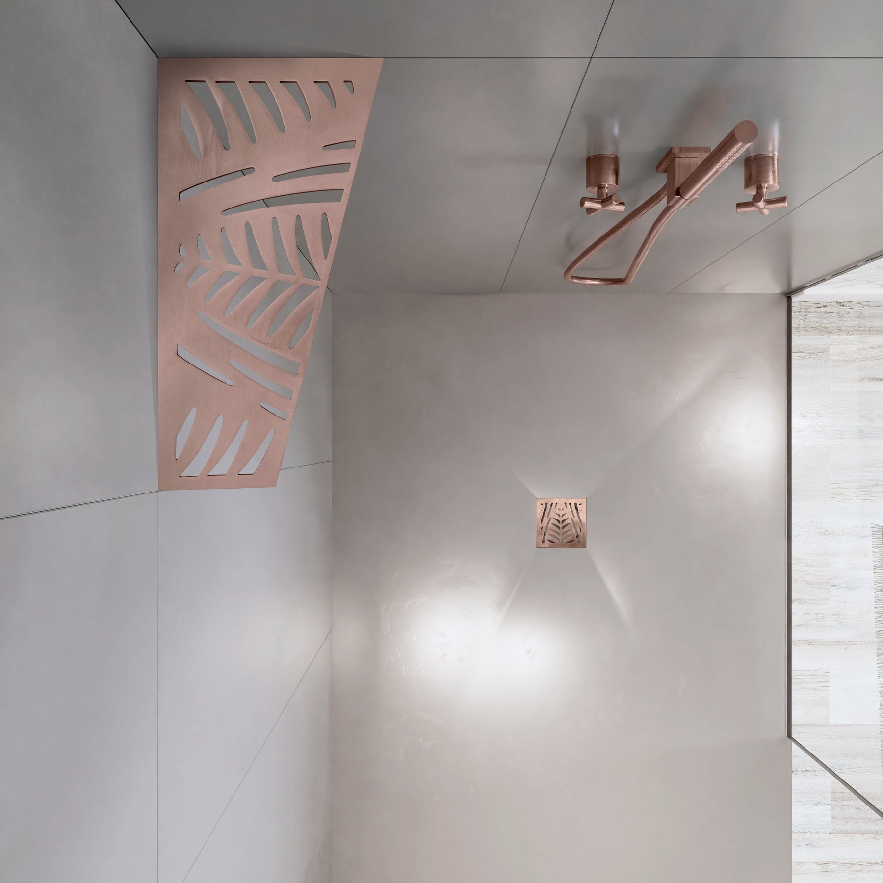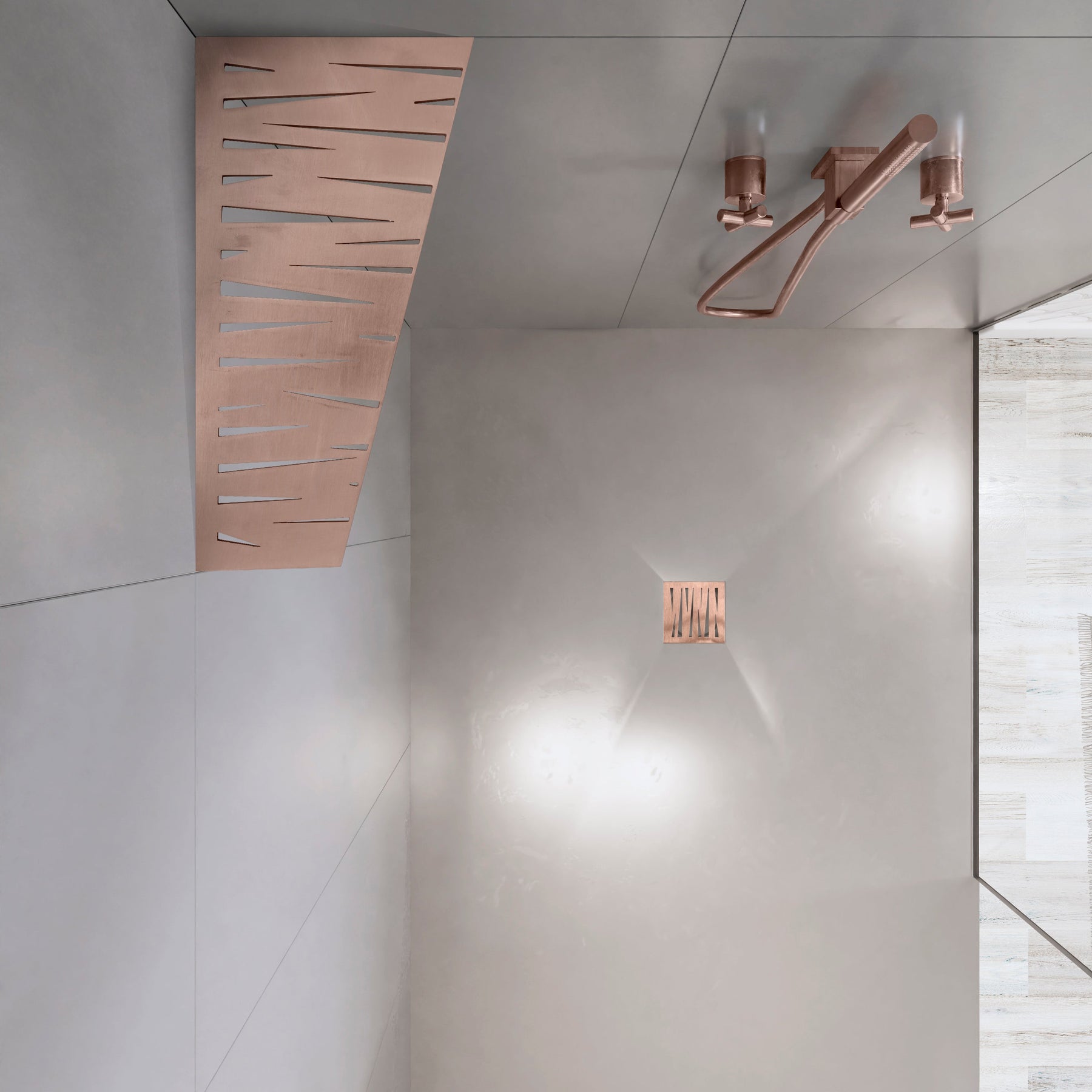 Tablettes d'angle, à fixer aux joints de carrelage, 12 modèles, PVD cuivre brossé, pour tout type de salle de bain.