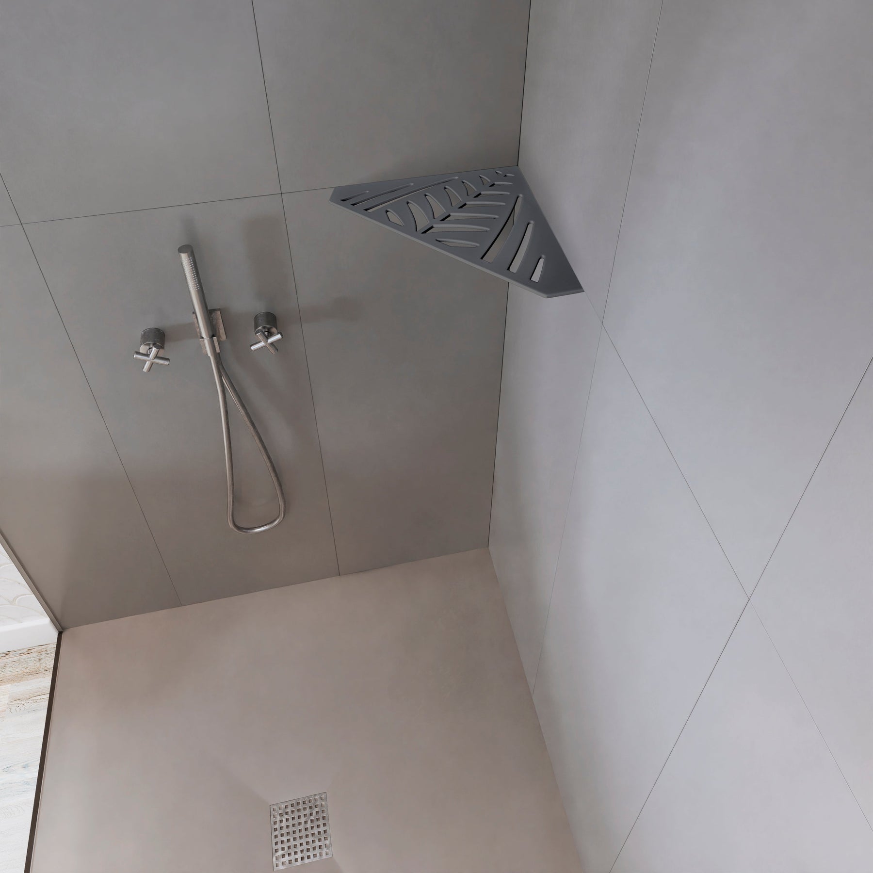 Tablettes d'angle, à fixer aux joints de carrelage, 12 modèles, gris ardoise, pour tout type de salle de bain.