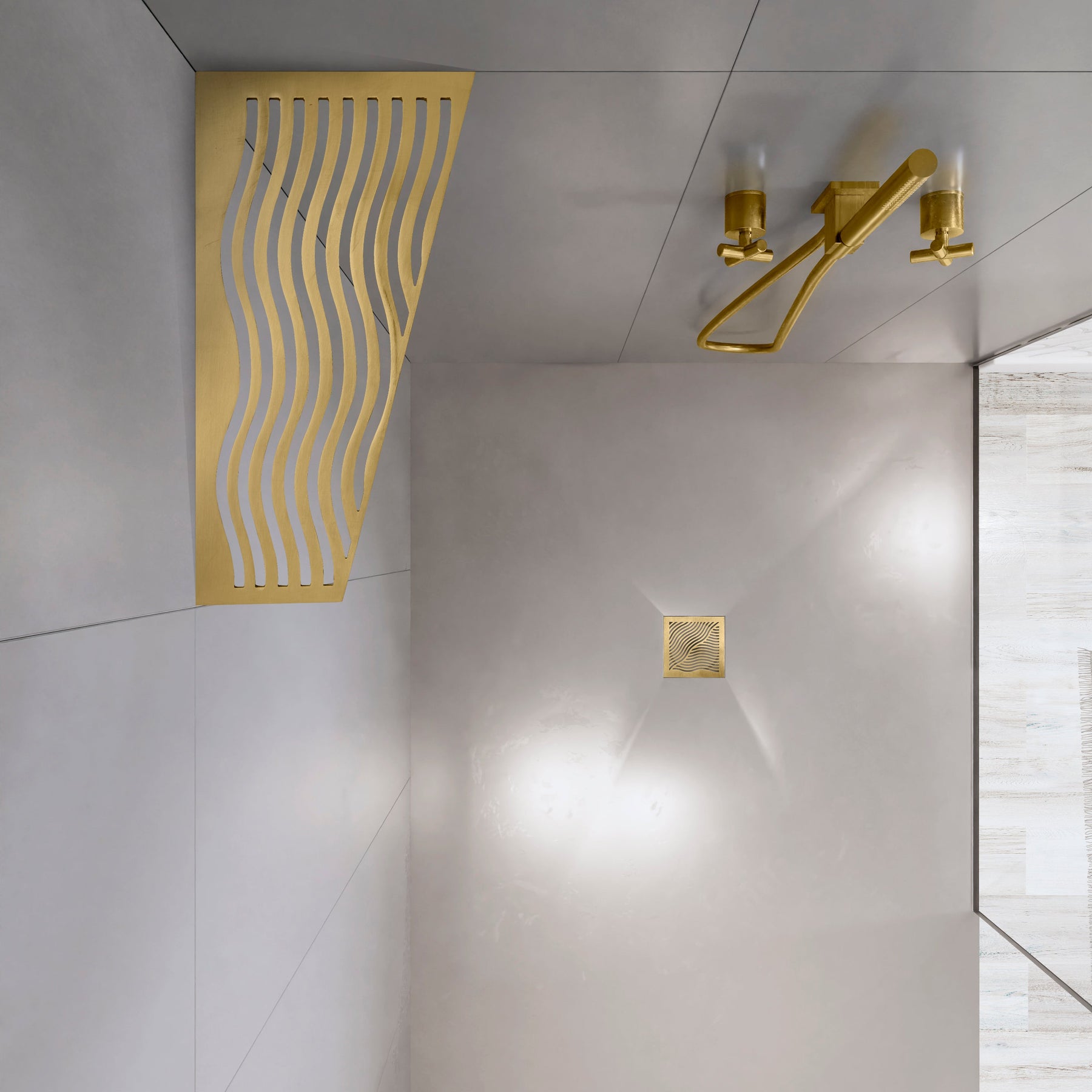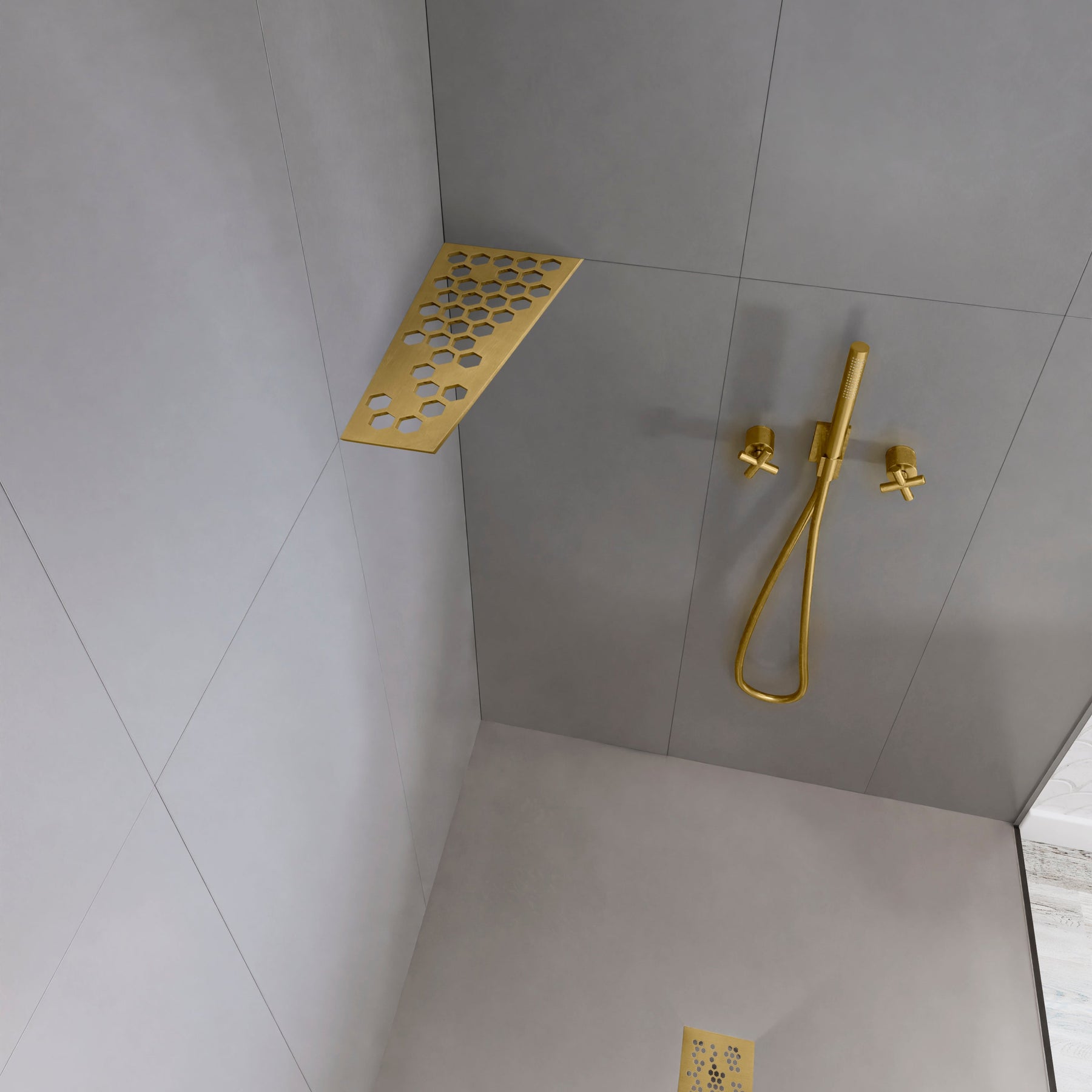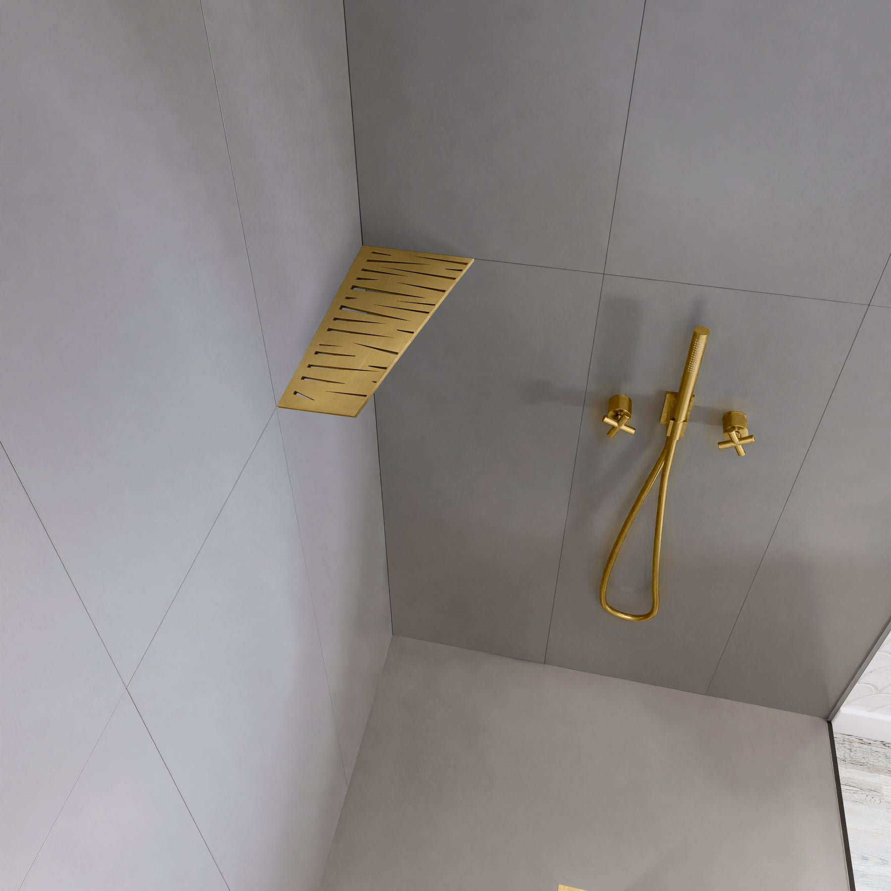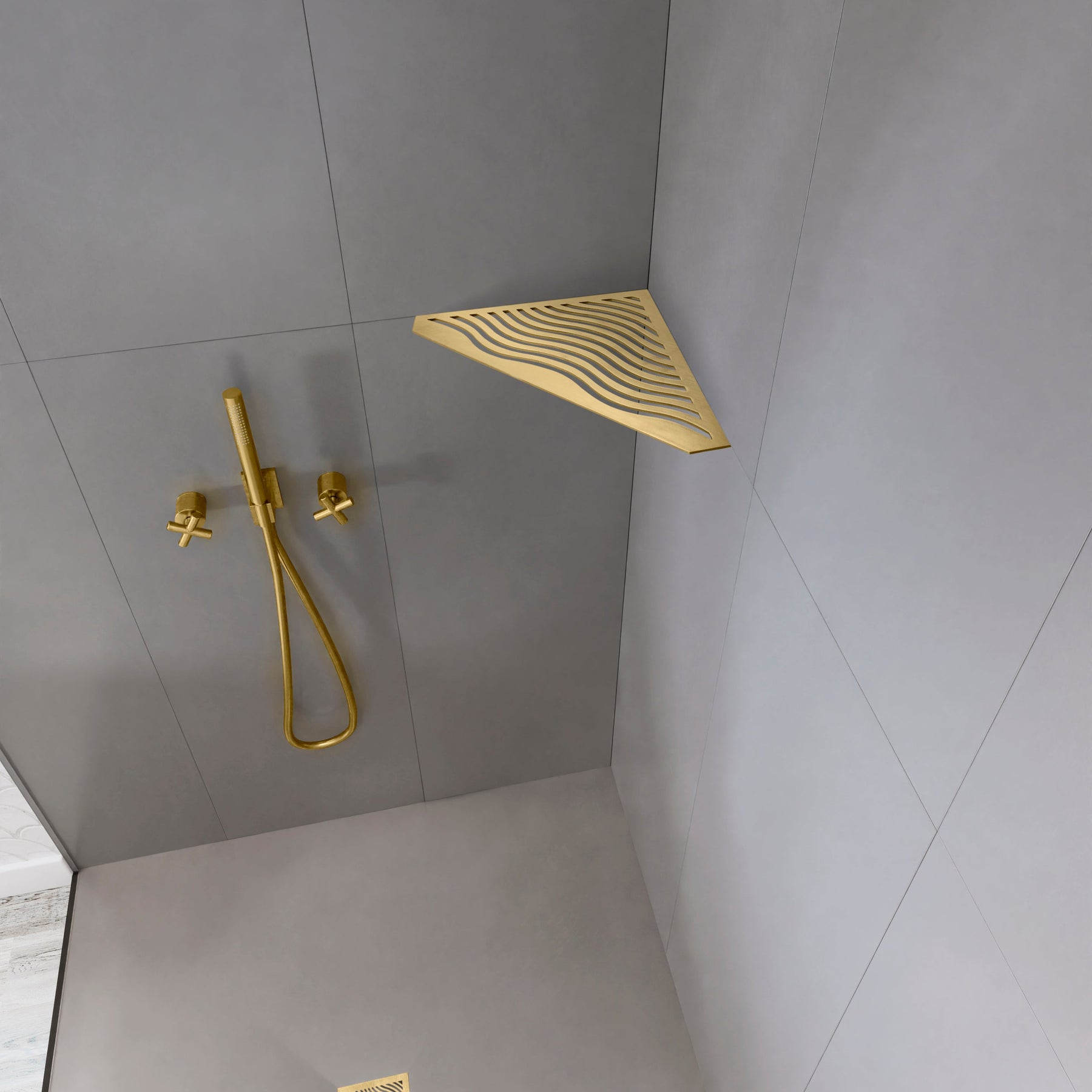 Tablettes d'angle, à fixer aux joints de carrelage, 12 modèles, PVD doré brossé, pour tout type de salle de bain.