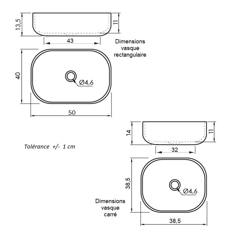 Option de finition : rectangulaire 50 x 40 cm ou carré 38,5 x 38,5 cm. Tolérance +/- 1 cm.